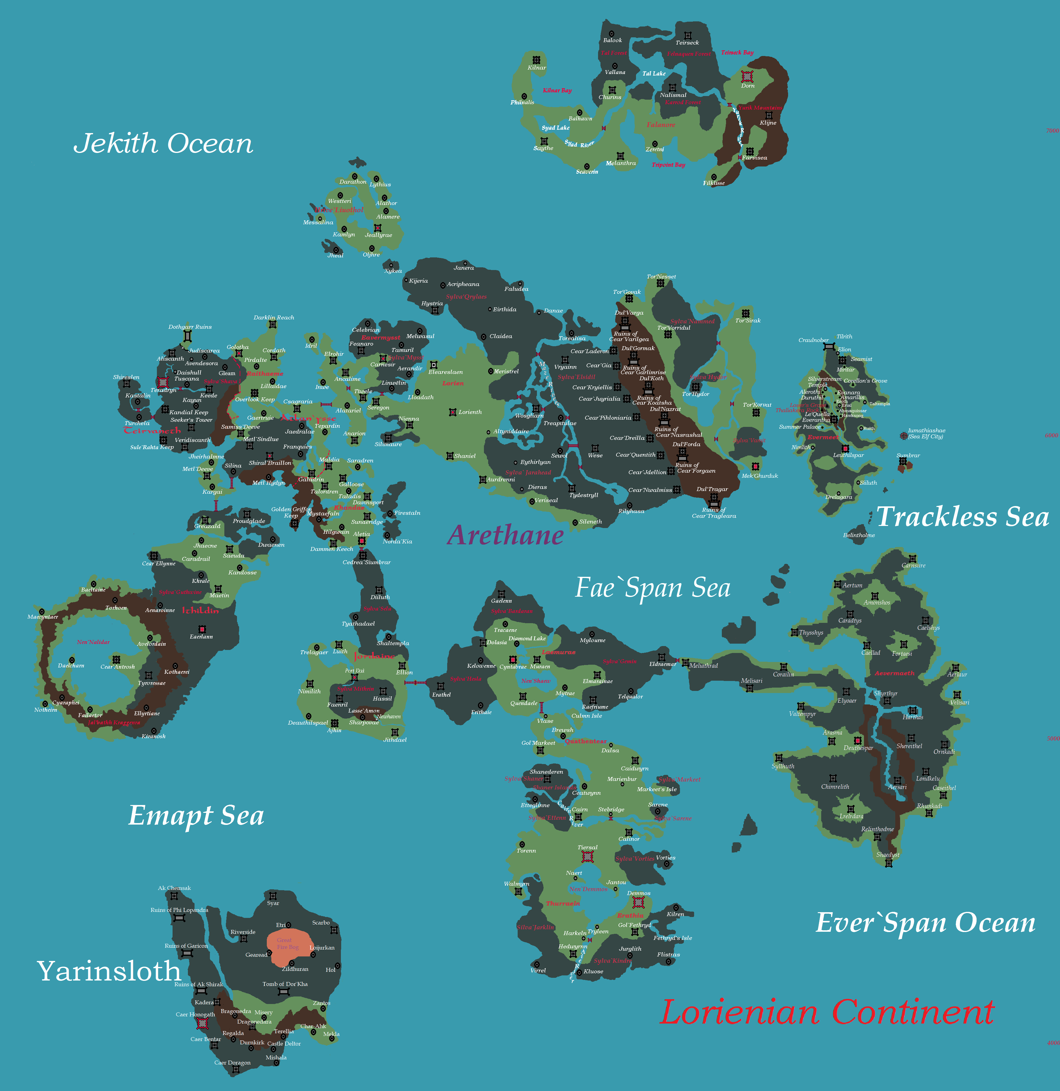 Nestled amidst the expanse of the ocean, the Lorienian Continent is a land of enchantment and mystery. The Archipelago Kingdom of Arethane makes up the entirety of the continent except for Yarinsloth and is mostly a realm of serene beauty and magical tranquility. Comprising several islands that collectively form its Ten Duchies and Six Principalities, Arethane is located east of the Laridian Continental mainland and consists of mostly forests of Mallorn Trees, as well as Oak, Birch, Willow, Maple and Pine. Here, the elves have woven their civilization into the very fabric of nature.