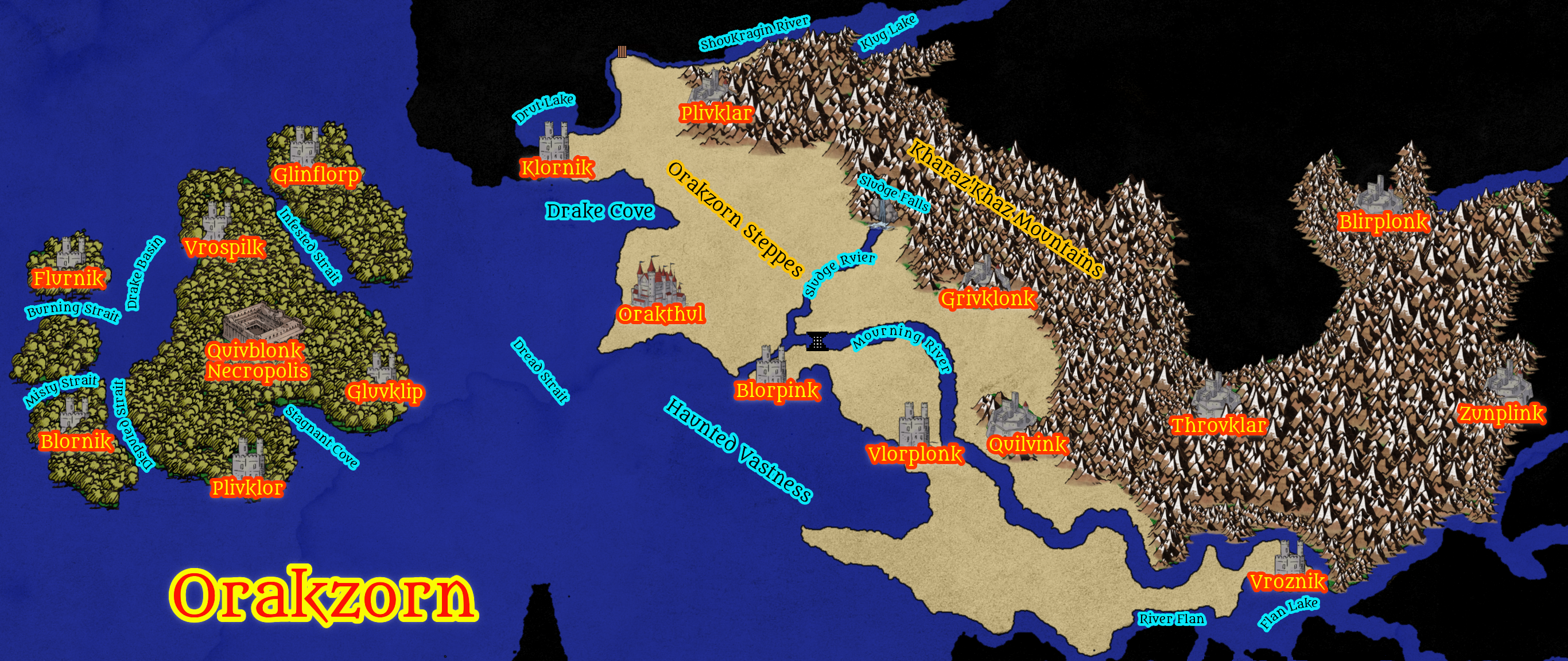- Orakthul, Capital of Orakzorn: The seat of the regional leadership and spiritual center of the region, home to the Moltenrune Clan and the Elder Council.