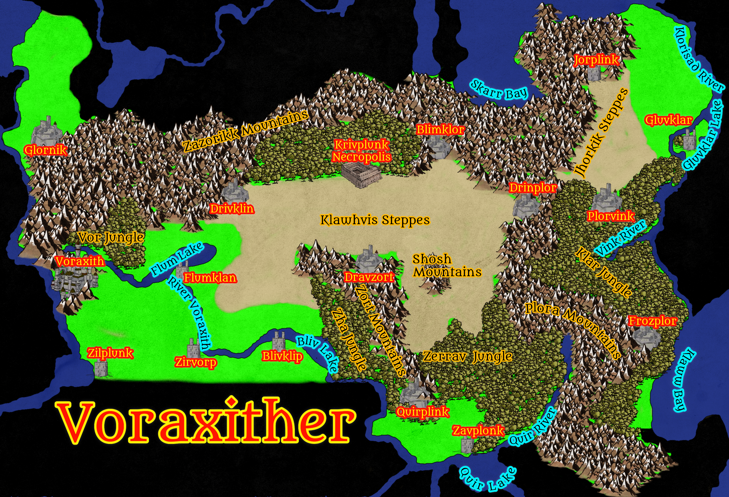 - Voraxith, Capital of Voraxither: Nestled in the mountains between plains and rivers, Voraxith thrives as the capital fortress, a political, military, and cultural hub whose walls guard the heart of the kingdom.