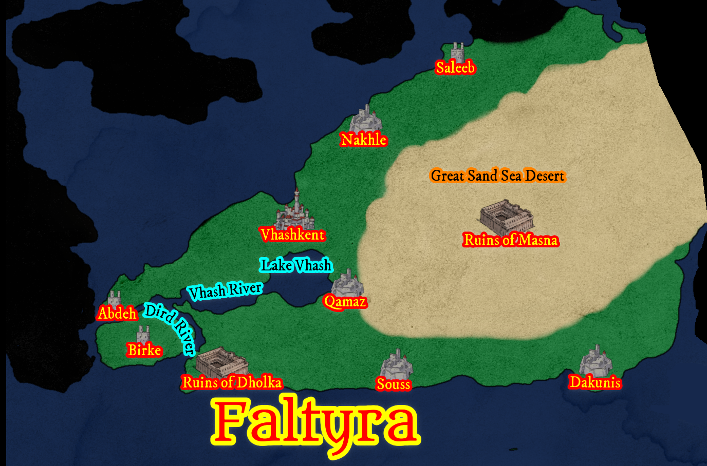 Oases and Fertile Land: The oases of Faltyra are the province's most valuable resources. These rare pockets of greenery, nourished by subterranean water supplies, are essential to the survival of the Faltyr people. Surrounded by towering date palms, lush greenery, and small plots of farmland, the oases are the centers of life in this otherwise desolate province. They are often the site of bustling trade routes, where merchants travel for days through the desert to bring goods from distant lands, and where the capital, Vhashkent, is supplied with food and other necessities.