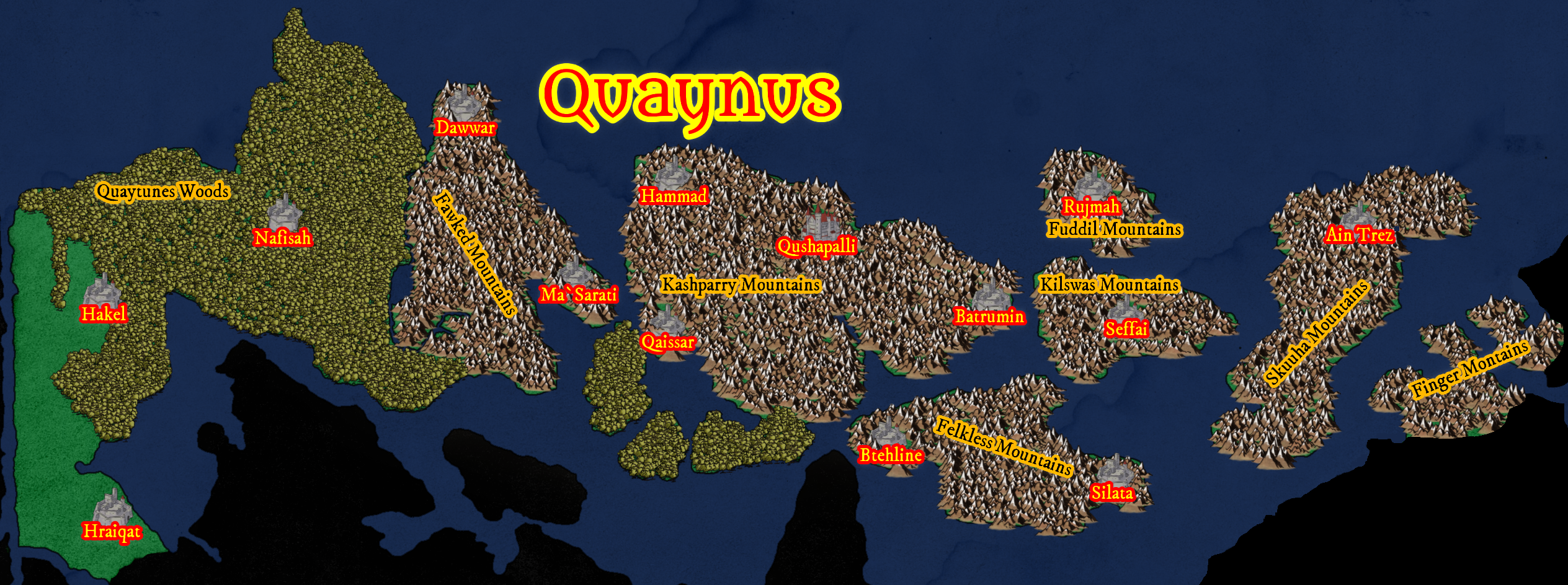 - Hammad: One of the oldest cities in Quaynus, known for its towering citadel and archives containing the early histories of the Mountain Troll clans. It serves as a secondary religious center after Qushapalli.