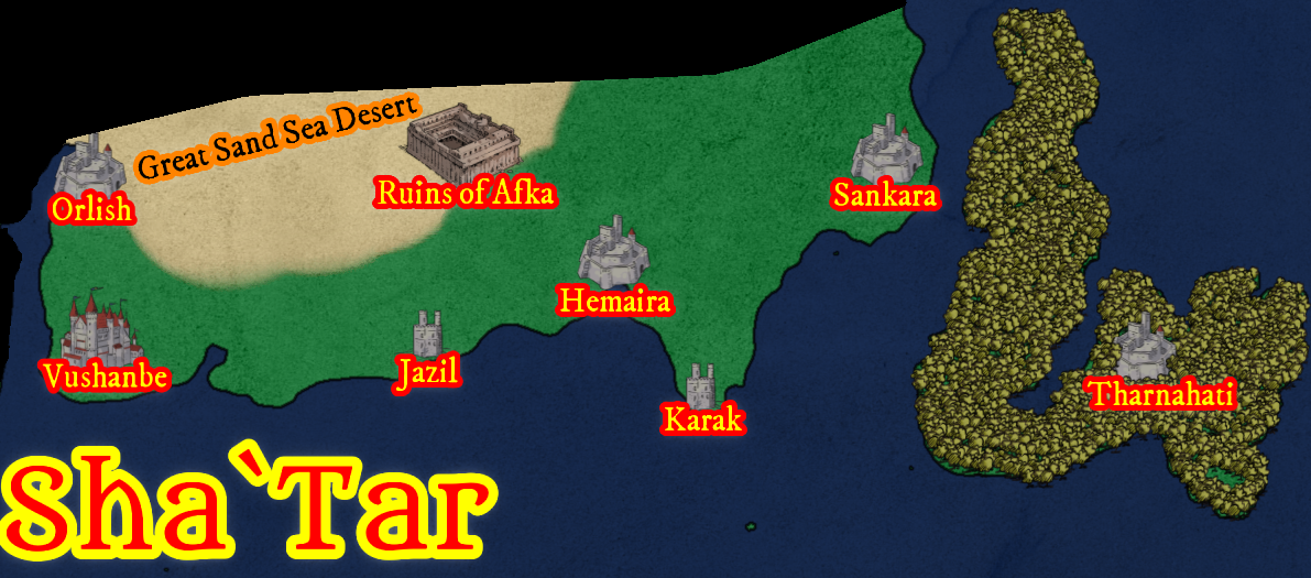 One of the most striking features of Sha`Tar is the presence of a large forested island amid the otherwise barren desert. This oasis of green provides a sharp contrast to the surrounding landscape, offering a place of refuge for those who have the means to settle there. The island's fertile land is vital to both the agriculture and trade of Sha`Tar, offering essential resources such as timber, fruits, and herbs, which are highly valued across the empire. It also serves as a strategic military base and a place of spiritual significance for the people of Sha`Tar, with several temples and ritual sites devoted to the dragon gods scattered throughout the island. This area remains a vital connection between the nomadic tribes and the more settled regions of the province, facilitating both cultural exchange and commerce.