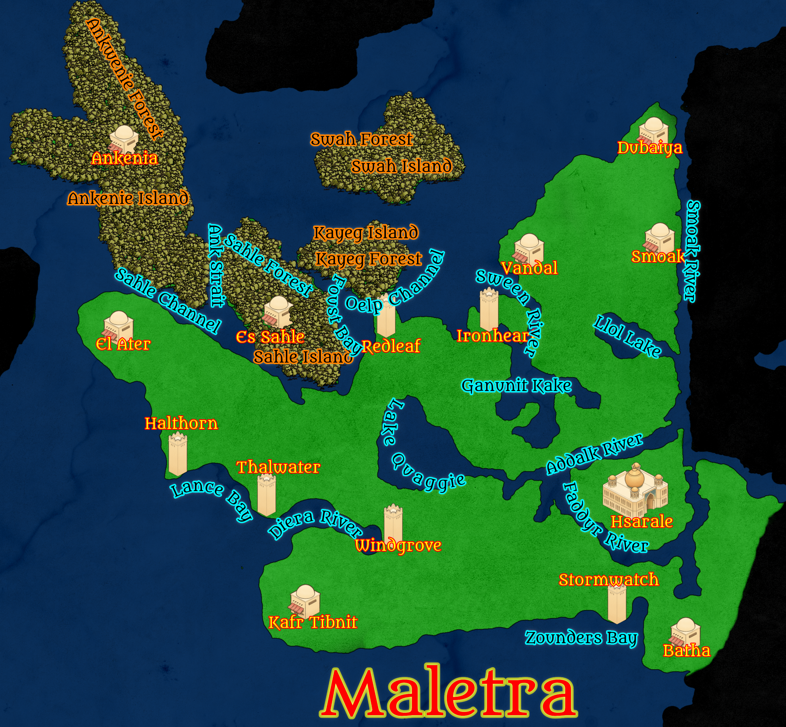 - El Ater: A powerful western port city guarding the Sahle Channel. Its shipyards and fortresses make it a cornerstone of Maletra's western defense and naval trade.