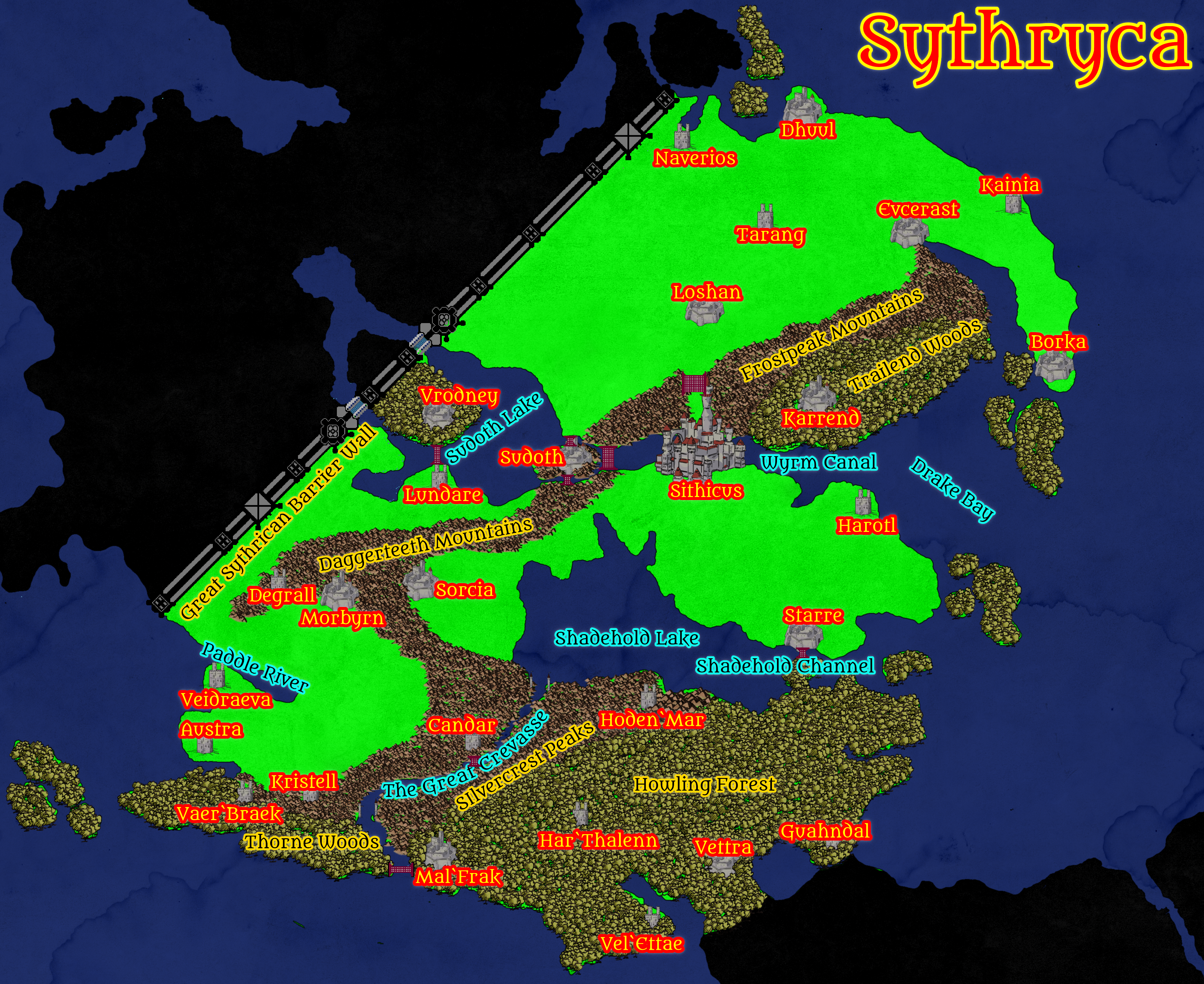 The Daggerteeth Range: East of the Frostpeaks lies the Daggerteeth Range, a jagged mountain chain known for its sharp, serrated peaks that resemble the fangs of a great beast. The range is steeped in dark legends, often described as cursed due to its association with Arangoth's necromantic influence. The land here is barren, scarred by ancient magical catastrophes and the occasional tremor of dark magic still seeping from the soil. Despite this, the Daggerteeth Range is strategically important, marking the boundary between Sythryca and the dark lands of Arangoth. It is also home to the Shadowspire Peaks, which rise above the rest and are considered sacred by many of Sythryca's warrior clans.