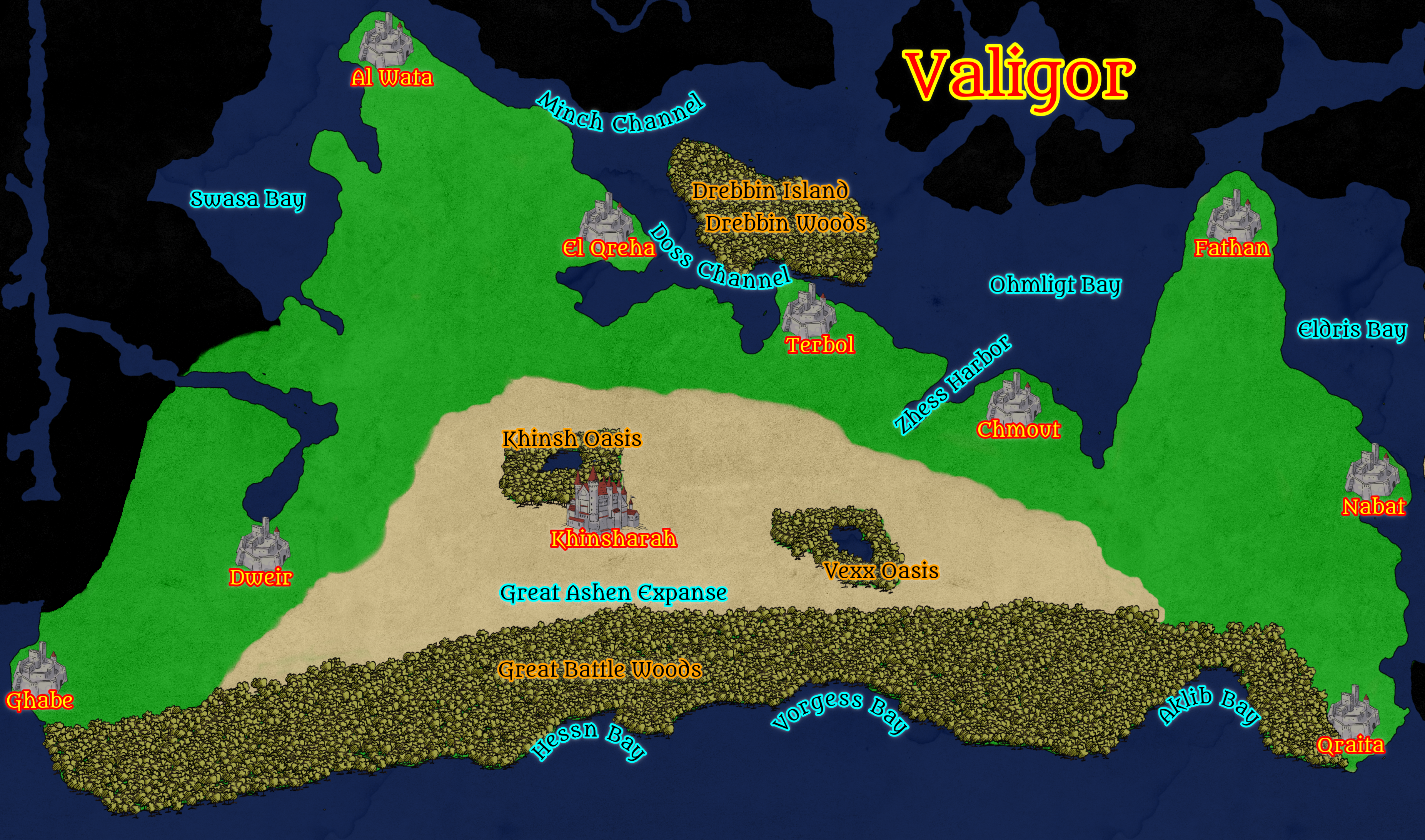 - Dweir: Dweir is a smaller, yet strategically important city located on the western border of Valigor. It serves as a critical crossroad for travelers and trade caravans coming from distant desert kingdoms. While it may not hold the military prestige of Khinsharah or Al Wata, Dweir plays a vital role in Valigor's diplomatic relations, acting as a center for negotiations, treaties, and the exchange of goods between Valigor and neighboring lands. It is a city where culture and diplomacy thrive alongside commerce.