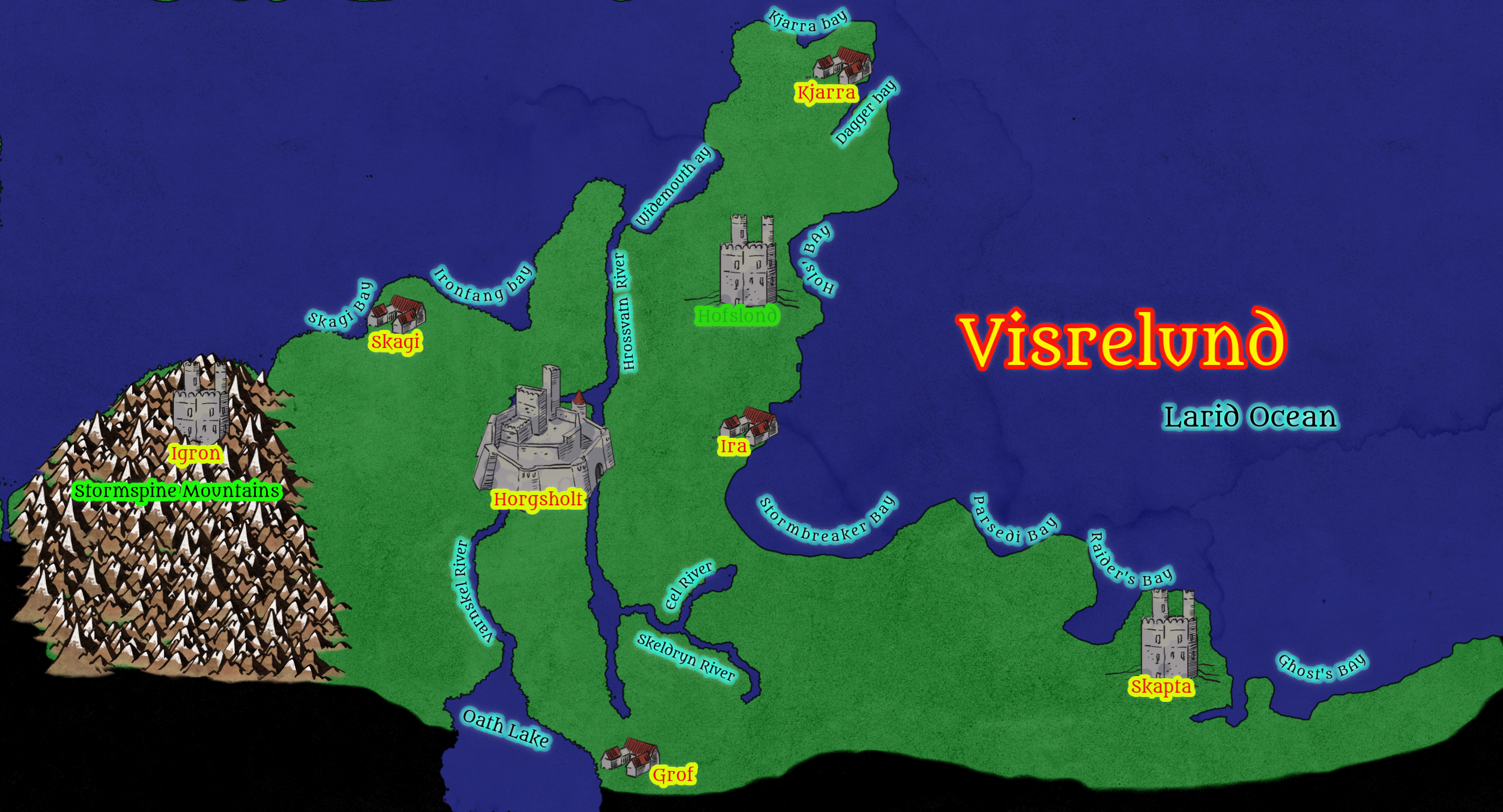 Visrelund occupies the northeastern reaches of Laridian, a realm shaped by salt, wind, and the relentless hand of nature. Jagged cliffs, narrow fjords, and hidden bays define the coast, while grassy plains and cold moorlands stretch inland. The mountains rise sharply, harboring Igron and Ursurik settlements. Rivers such as the Varnskel, Hrossvatn, and Skeldryn carve fertile valleys and provide passage from inland lakes to the sea.