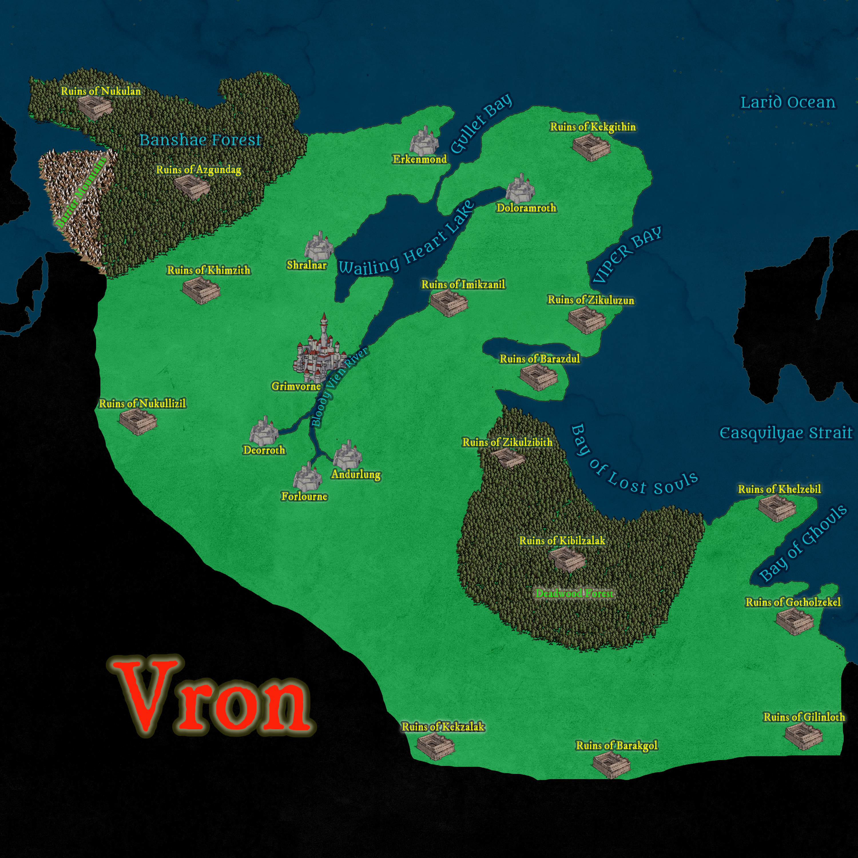 Vron is mostly a land of ruins, haunted by the echoes of its glorious past. There are still a few cities that remain mostly intact, but even these show the years of neglect and decay. Among the most notable remnants are the Ruins of Grimvorne and Kekzalak, once great cities and strongholds, now twisted and corrupted by the undead.