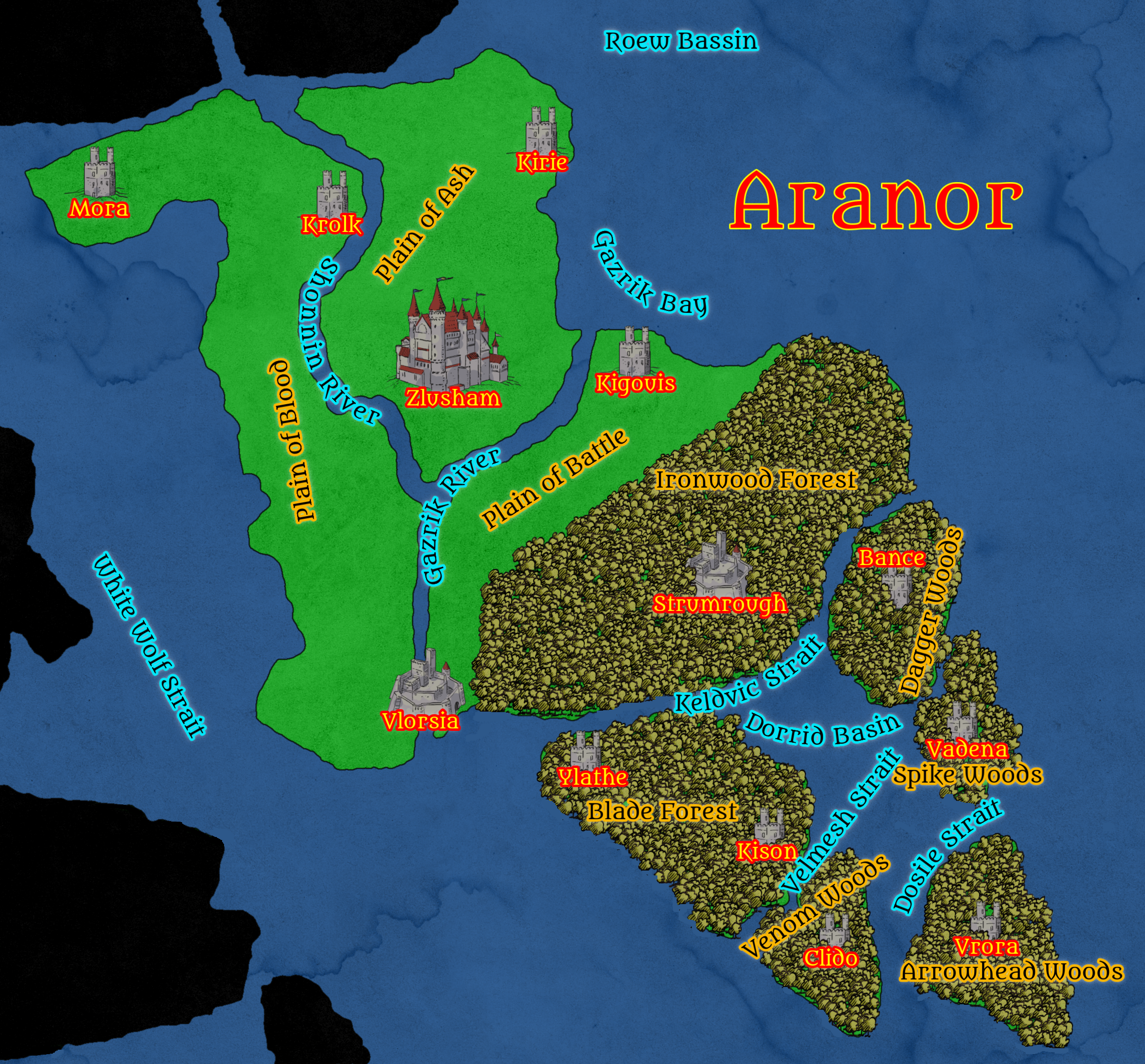 - Vadena: Vadena is a city that serves as a Coyle-controlled port on the edge of the kingdom. Though Aranor is not a maritime power, Vadena allows the Coyle to exert influence over the waterways, providing the kingdom with opportunities for maritime raids and controlling coastal trade routes.