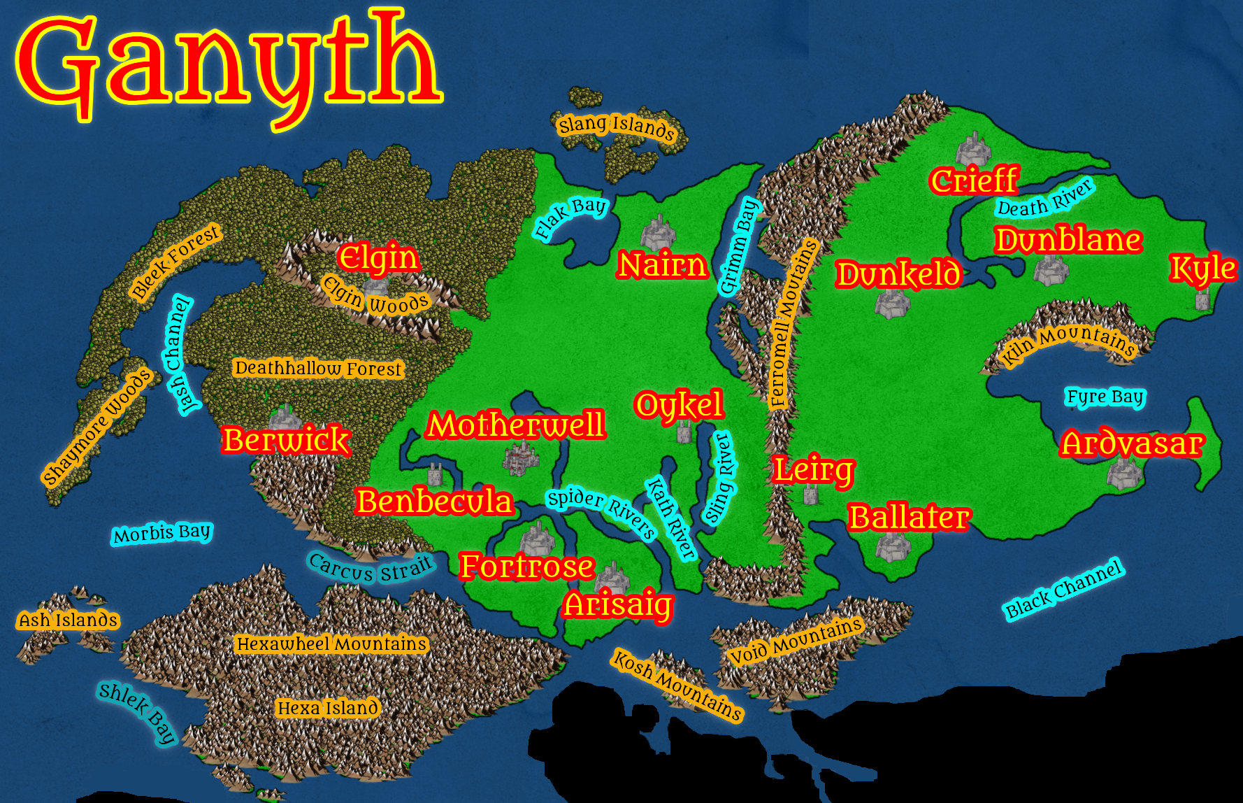 - Elgin: Hidden deep within the Elgin Woods, this secluded mountain city thrives on trade in rare herbs and enchanted timber. Elgin is home to the Druidic Circle of the Green Flame, guardians of Ganyth's oldest natural sanctuaries.