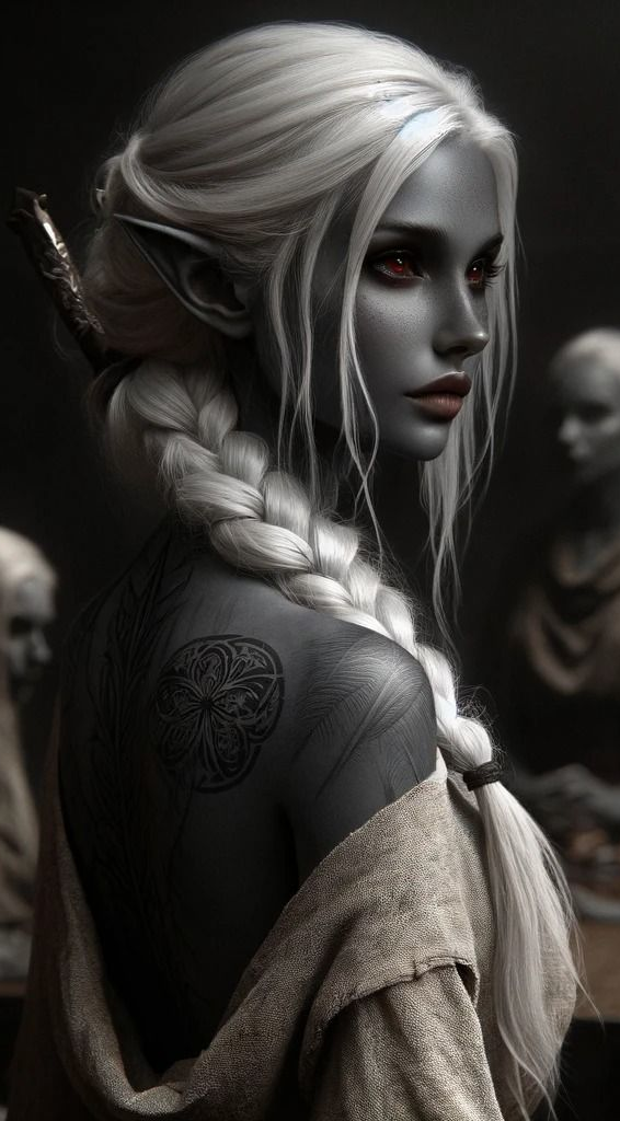 In the eldritch city of Menzoberranzan, Talabrina was a striking figure, slender, delicate, and standing at a height of 5 ft 11 in. Adorned with the customary ebony skin and thick white hair of her drow kin, her expressive red eyes hinted at both intelligence and a penchant for mischief. Regarded as one of the most beautiful drow females in Menzoberranzan, she navigated the intricacies of her society with a sardonic and witty personality, often engaging in practical jokes.