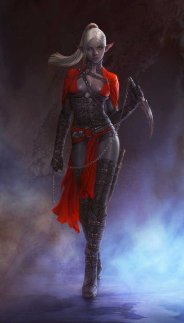 She wears skin tight clothing of black patent leather, even her armour is designed in that way. She typically sets accents with blood red silk cloths and tops. Leather straps keep her already tight outfit aligned with her skin, which she presents in a few places. She carries her primary weapon, a curved short sword, hanging from a relatively fine chain around her waist. The punch holes of the leather strap around her chest are filled with rivets.