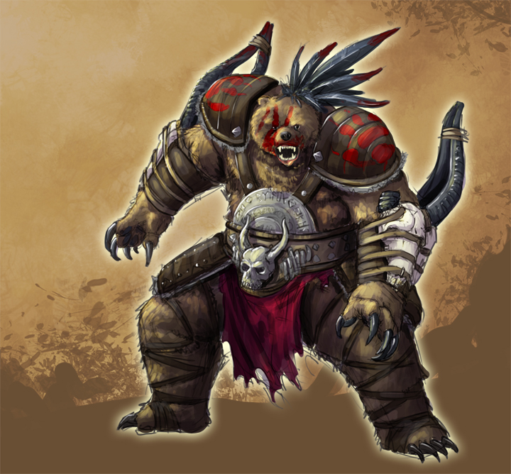 From a distance, Nal Resse`Baelthir might be mistaken for a grizly bear. She is towering and full-framed, with powerful limbs. Nal stands and squats; she never sits. She is always looking around and occasionally sniffing. She rarely speaks, and when she does, it's in phrases, not sentences. A quiet being, she enjoys the serenity of nature and its cadence of sounds. What she loathes are humans and all their cacophony: horses with armored riders, clunky wagons, or noisy adventurers looking for fortune far from home. Nal detests humankind and actively fights against its encroachment. Like a weed, human civilization spreads, and Nal believes it is her duty to cut it back and with good reason.