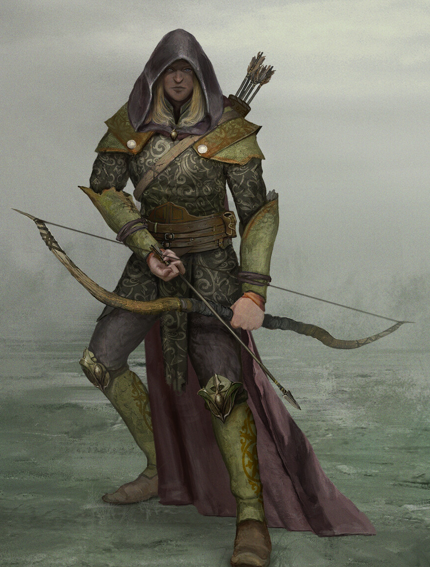 In his daily attire, Landaris chooses deerskin traveling clothes, reflecting his affinity for the natural world and his role as a Ranger. On occasion, he dons a full set of Elven-made tooled leather and chain armor, meticulously marked with the holy symbol of Nethra, showcasing his devotion to the divine and his clerical abilities. This armor not only provides protection but also serves as a testament to his commitment to safeguarding the principles and values upheld by his people.