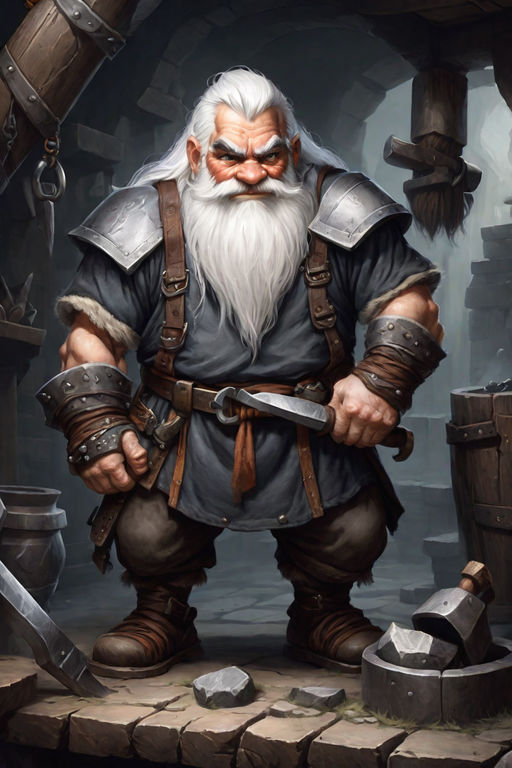 In the depths of Unity Forge, where the flames of creation dance with the crackle of lightning, there stands a figure of immense power and renown, Forgemaster Elvindir Ironforge, an ancient Mountain Dwarf and decendant of the legendary Thraindur Ironforge, whose mastery of the forge is matched only by his command over the forces of thunder and lightning. Standing nearly five feet tall, with ruddy tan skin weathered by centuries of toil, Elvindir cuts a formidable figure amidst the fiery glow of the forge. His white hair, tied up in a pile of braids, speaks of wisdom and experience earned over countless years of craftsmanship. Yet, it is the magical runes etched into the sides of his head that truly set him apart, symbols of arcane power that grant him the ability to shape lightning itself into any form his heart desires. As the architect and overseer of Unity Forge, Elvindir's hand guides the dwarven artisans in the creation of thunder-forged weapons and other magical items of unparalleled potency. Under his tutelage, the forge has become a bastion of craftsmanship and innovation, its halls ringing with the echoes of hammers on anvils and the crackle of magical energies. Yet, despite his mastery and the awe-inspiring power he wields, Elvindir is a dwarf of great humility and respect. He greets all who venture past the doors of Unity Forge with a nod of acknowledgment, recognizing the strength and determination it takes to reach his domain. For the road to the Forge through Elven lands is not an easy one, and those who seek to possess the weapons forged within its walls must prove themselves worthy of such great power. But woe betide any who dare to approach with ill intent, for Elvindir's wrath is as swift and merciless as the thunderstorm itself. With a stroke of his greatsword, crackling with blue lightning, he metes out justice to any who would seek to defile the sanctity of his domain, ensuring that only those of true honor and integrity are deemed worthy to wield the weapons of Unity Forge. And so, amidst the flames of creation and the fury of the storm, Forgemaster Elvindir stands as a beacon of dwarven craftsmanship and arcane power, his legacy echoing through the ages as a testament to the indomitable spirit of those who dare to harness the forces of lightning and thunder. |