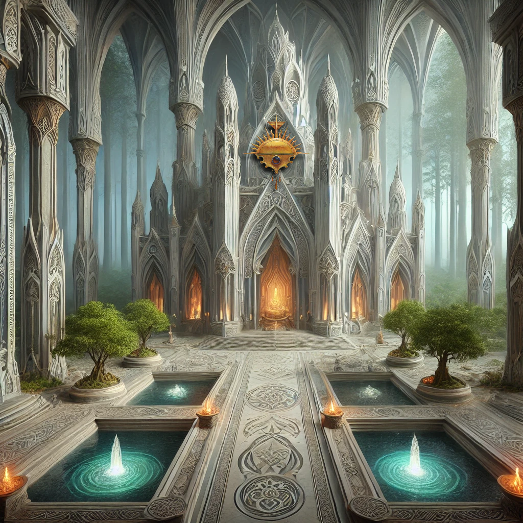 - Temples: Temples dedicated to Labelas Enoreth are often grand structures, designed to embody the passage of time and the longevity of the elves. They are usually built with stone, incorporating intricate carvings that depict the history of the elves and the celestial alignment of the stars. These temples are located in serene, natural settings such as ancient forests or atop hills where sunsets can be observed daily.
