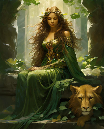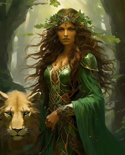 - A crown of woven branches and leaves, representing her authority over the natural world.