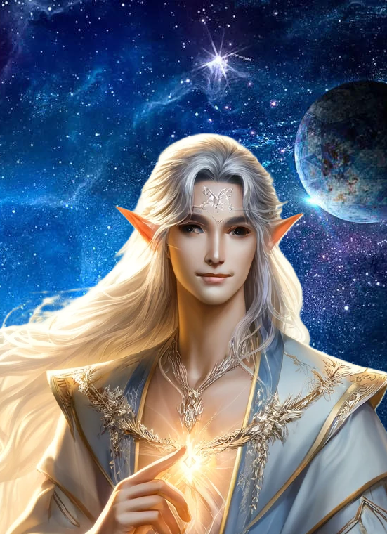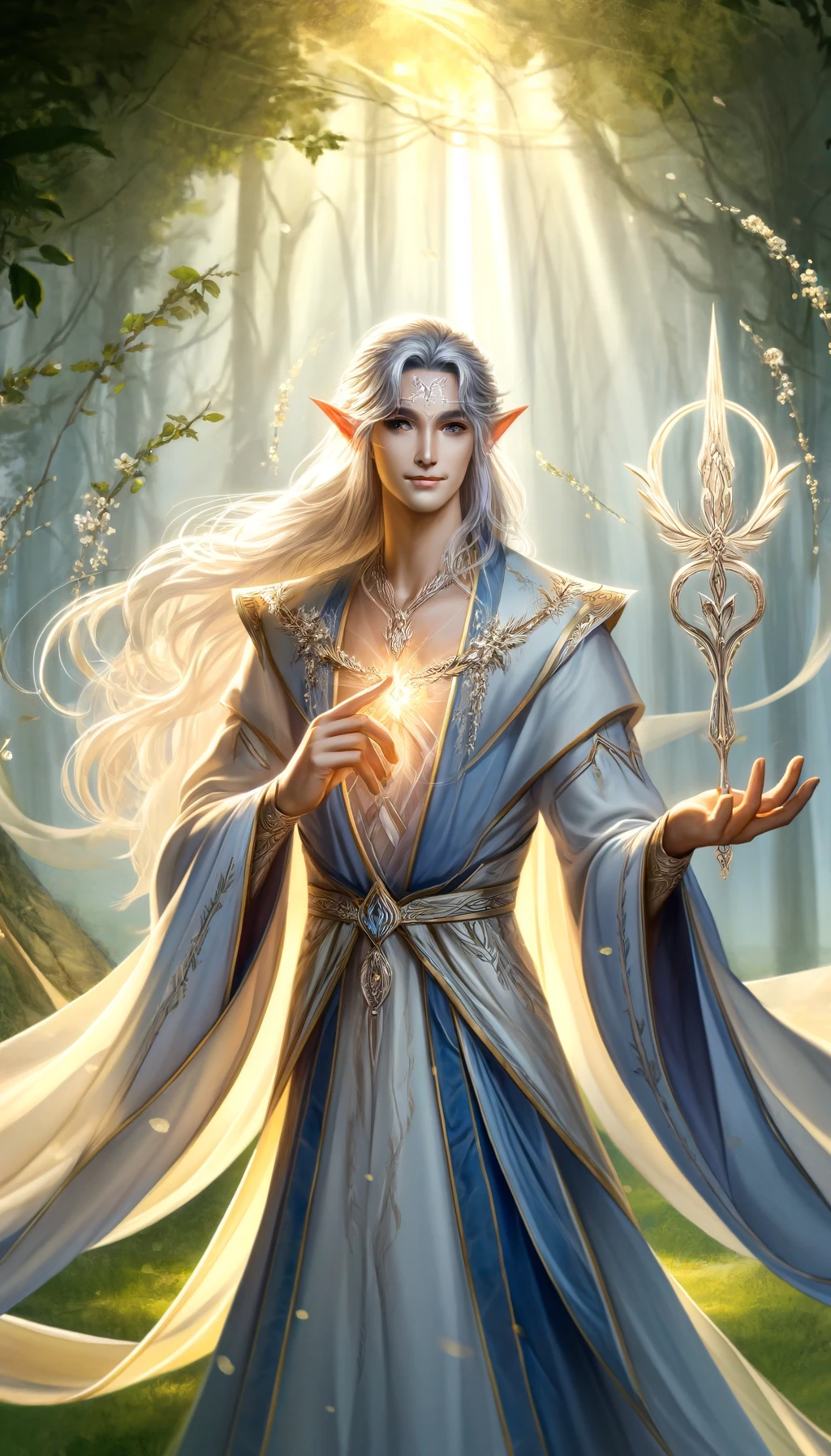 - Appearance: Shai`tan is often depicted as a tall, graceful Elven figure with silver hair flowing down his back, radiating a soft, ethereal light. His eyes glow with warmth and kindness, reflecting his nature as a healer and protector. He is usually adorned in elegant, flowing robes of blue and gold, symbolizing his connection to healing and the sun. In his presence, there is an aura of calm and serenity, as if the very essence of peace surrounds him. His demeanor is gentle yet authoritative, embodying both mercy and justice in his every gesture.