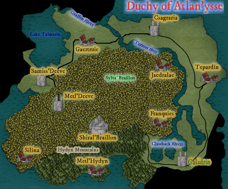 - Ruler: Detharryn Nar`Xiad, Duke of Atlan`Ysse and Aglaranna Nar`Xiad, Duchess of Atlan`Ysse