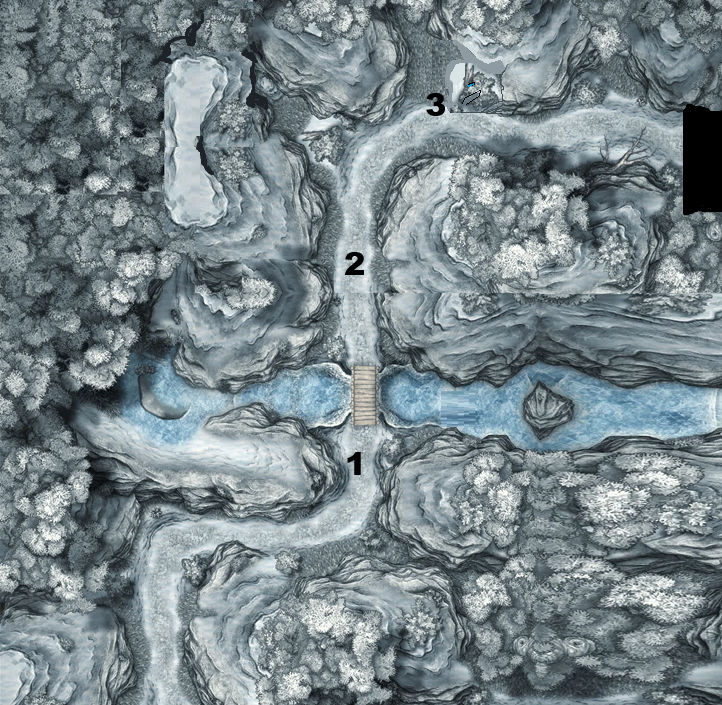 A band of mountain trolls, lurking in the shadows of the craggy cliffs, wait to ambush the adventurers by the bridge. These brutish creatures are armed with crude weapons and seek to plunder any valuables the party possesses.