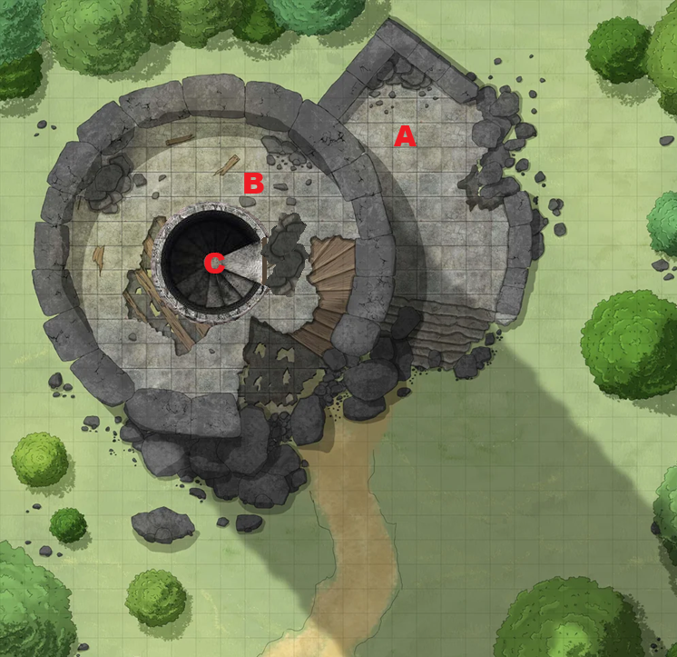With the Wargs defeated or driven off you have time to really look at the squat stone tower has been built at the center of the glade. The tower has been shattered, and all that remains is a ragged stump of fitted stone. Large blocks of granite litter the clearing, and some of these are covered with thick moss. The tower is a wreck; the ruins hundreds of years old, and it looks like it has been blasted by a bolt of lightning. Originally it might have been 40 feet tall, but now it is a blasted stump that does not extend more than 10 feet high. The tower wall nearest the characters is no more than a low wall a foot high, and can be easily stepped over.
