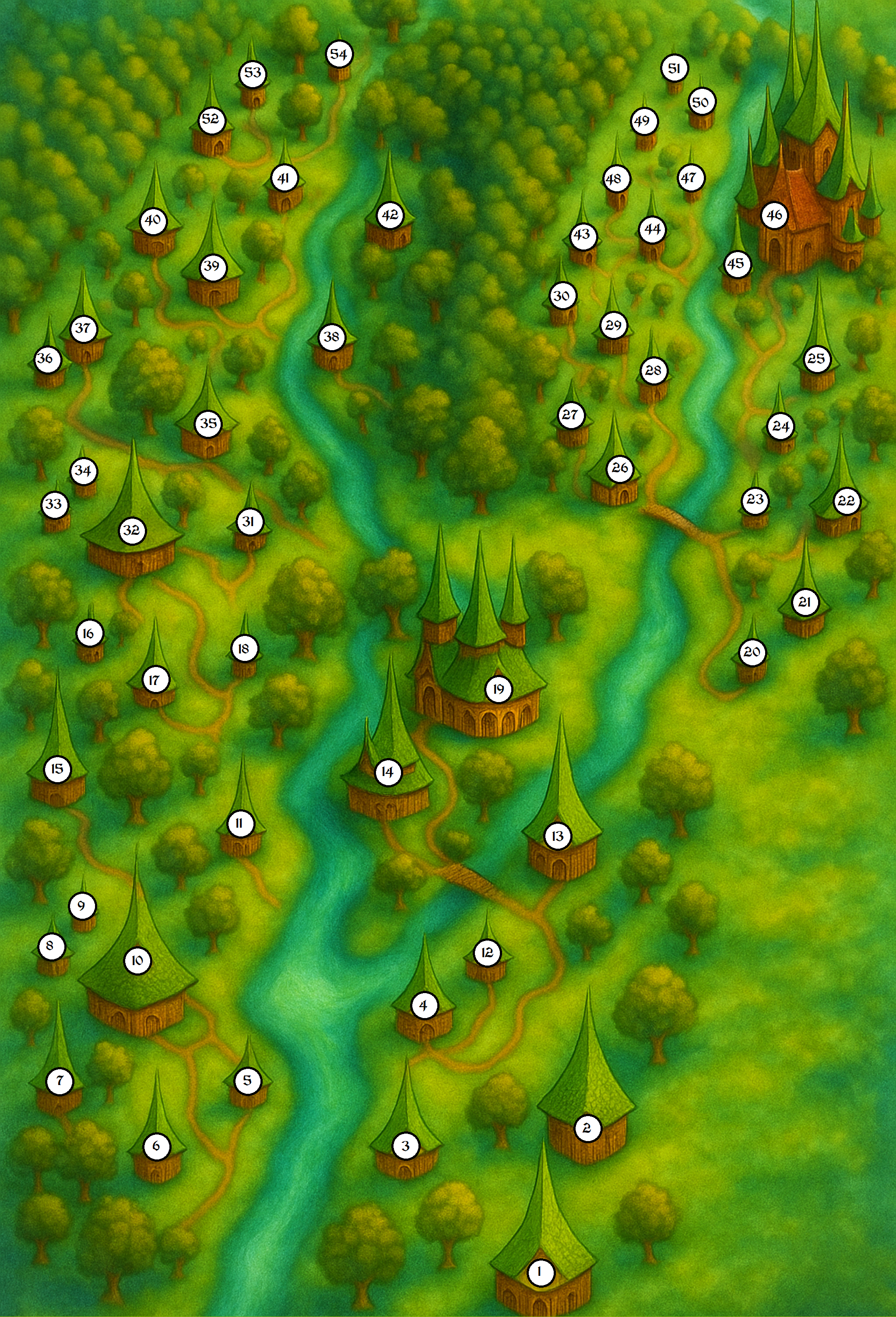 Unlike the glittering spires of Teradryn or the scholarly austerity of Port Dal, Varrondale embraces an agrarian elegance. Its buildings are crafted from living wood and stone drawn gently from the earth, shaped by spell and song rather than tool. Roofs bloom with moss and vine, wind chimes sing in forgotten dialects, and water runs clear from enchanted wells. Each home is blessed with minor magics, wards of warmth, healing lights, and protective charms against illness or predator.