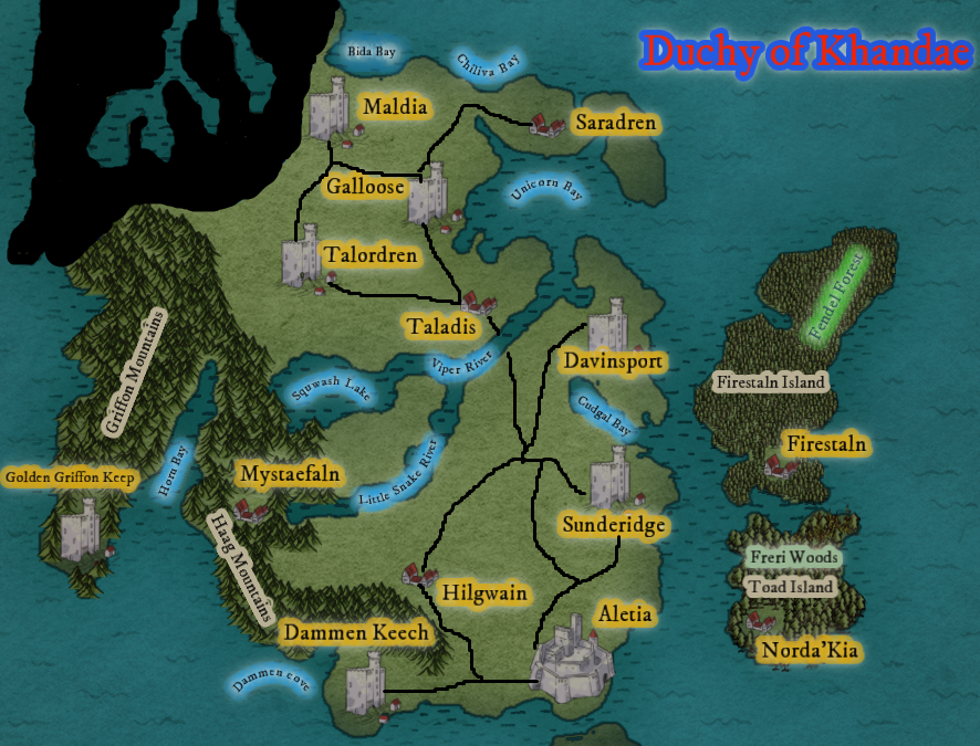 Duchy of KhandaeOnce part of the world of Harn, the ancient Kingdom of Kanday had long endured the constant border wars and political decay that plagued its neighbors. Known for its stoic nobility and traditions of chivalry, Kanday slowly succumbed to cultural rot and infiltration, particularly along its frontier with Rethem, a realm increasingly influenced by Agrikan cults and clandestine changeling agents. Rhysanus Ariquis, then a seasoned Grey Elven warlock, ranger, and member of the adventurer band known as Golden Gryphon Mercenaries and aving been raised under the shadow of changeling betrayal in Retheme. Having endured brutal state training and magical experimentation, Rhysanus emerged as a grim but visionary leader. Despite the bonds he had formed with the heroes of the Golden Griffin Keep, Rhysanus' allegiance to Styphon eventually took precedence. At the dark god's command, he bid farewell to his companions, his eyes set on greater conquests. Styphon, recognizing Rhysanus' insatiable ambition and ruthless efficiency, entrusted him with a massive demon army, a formidable force capable of toppling kingdoms. Rhysanus led this demonic horde with unmatched strategic brilliance, conquering several realms with relentless precision. Retheme, his homeland, fell first, its defenses no match for the combined might of Rhysanus and his infernal legions. With each victory, his power grew, and his name became synonymous with fear and domination. He took great pride in the destruction of the Changeling who began his raise to power. Next, he turned his attention to Kanday, home of the Hero's of Golden Gryphon Keep. By the time the defender's realized Rhysanus was behind the Army of Demons it was too late, The kingdom's valiant defenders fought bravely, but they were ultimately overwhelmed by the onslaught of demonic forces. Rhysanus' tactical acumen and magical prowess proved too much for even the most seasoned warriors, and Kanday soon fell under his rule. From there, his conquests extended to the world of Palladia. The once-great kingdoms of Timiro and the Eastern Territories crumbled before his might. Cities burned, armies shattered, and rulers bowed to his will. The land was reshaped in Rhysanus' image, a testament to his unyielding ambition and the dark power that fueled his rise. Through these conquests, Rhysanus' legend grew. He became a figure of awe and terror, a leader whose name was whispered with a mixture of reverence and dread. His extensive library of magical texts, his horde of powerful artifacts, and his profound understanding of the arcane made him a force like no other. His judicious use of psionic ability and magic allowed him to maintain control over his vast empire, ensuring that his subjects remained loyal, and his enemies were kept at bay. He consolidated the conquered kingdoms into two unified realms, one on Harn and one Palladium, a testament to his strategic genius and ruthless determination. The lands on Palladium he gave over to his Demon Familiar whom he had commanded to take his form. Harn, he kept to himself and with the lands under his control, Rhysanus embarked on a world-walking journey, a quest for new conquests and greater power. It was during this exploration that he stumbled upon the Kingdom of Falanore within the World of Otara. Little is known of his time as a World Walker. Styphon was much desirous of being first among the gods, and thought that the elves were the key to this. Through the worship of all elves, he would ascend to the position of Supreme power. With the worship of Rhysanus he saw yet again a chance to accomplish this goal. Styphon was well aware of the magics cast so many years ago by King Rhysal Starweaver and of the prophecy of the dragon queen Alestria. Within Rhysanus he found his prophesized Elven King. Styphon brought Rhysanus to Otara along with much of the Elven lands Rhysanus ruled on another world and merged them with Arethane. He then set Rhysanus with the task to overthrow the Shadow Elves and restoring the elves to grey elf rule, as well as the establishment of Dragonwright and the worship of Styphon as the principle god of the elves. Rhysanus up until this time was a very devote worshiper and quite evil. He had already conquered several realms in his own right and was as said, an extremely powerful mage and warrior. When his lands were merged with Arethane by his God, he proceeded to do just as commanded, and in short order removed the Shadow Elves from Arethane. As the only surviving member of the royal house that could be found was a mere baby and that Rhysanus was able to draw the Kingsword of the elves he was accepted as King of the elves of Arethane, Kanday became the Duchy of Khandae. Notable Figures of Khandae