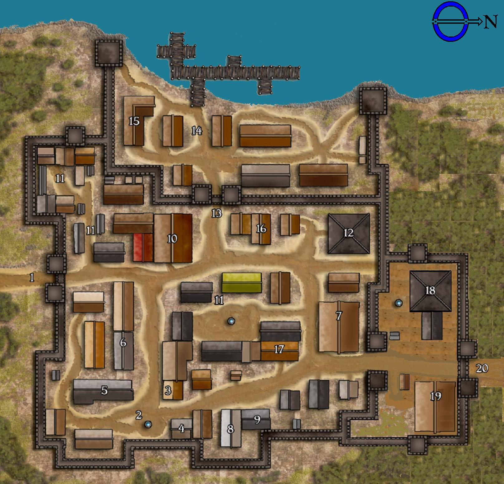 South Gate, comprises one of the town’s primary entrances and is the gate off the main road to Teradryn. This gates stand open during the day, leaving a 20-by-20-foot path that leads through the wall and into the city. A walkway crosses over the opening, connecting either side of the wall. Two towers, which are part of the wall, rise 40 feet above a gate. South Gate is closed and locked at night, though can be opened for people leaving the town. The gate is staffed by a group of four guards on a 6 hour rotation.