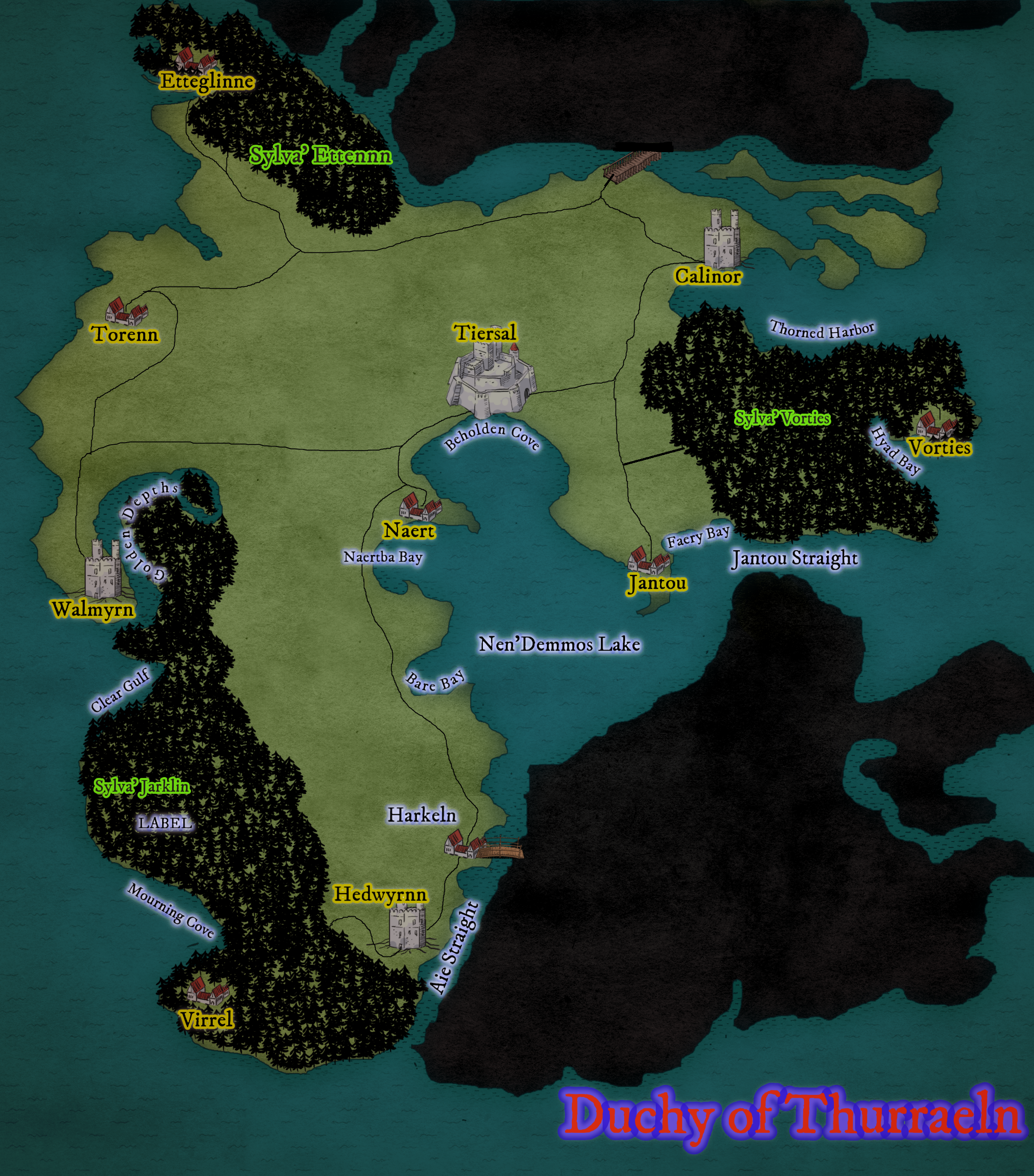 Thurraeln is a deeply spiritual and contemplative realm. Its people are mainly nomads who are gardeners, caretakers, and soul-workers. They do not build with grand towers or mighty walls but with stone gardens, woven shrines, and living sanctuaries. There are only 3 permanent cities and 5 permanent towns in the Duchy with an unknown number of unnamed Transient Villages that are often hidden among flowered groves or wrapped around sacred springs.