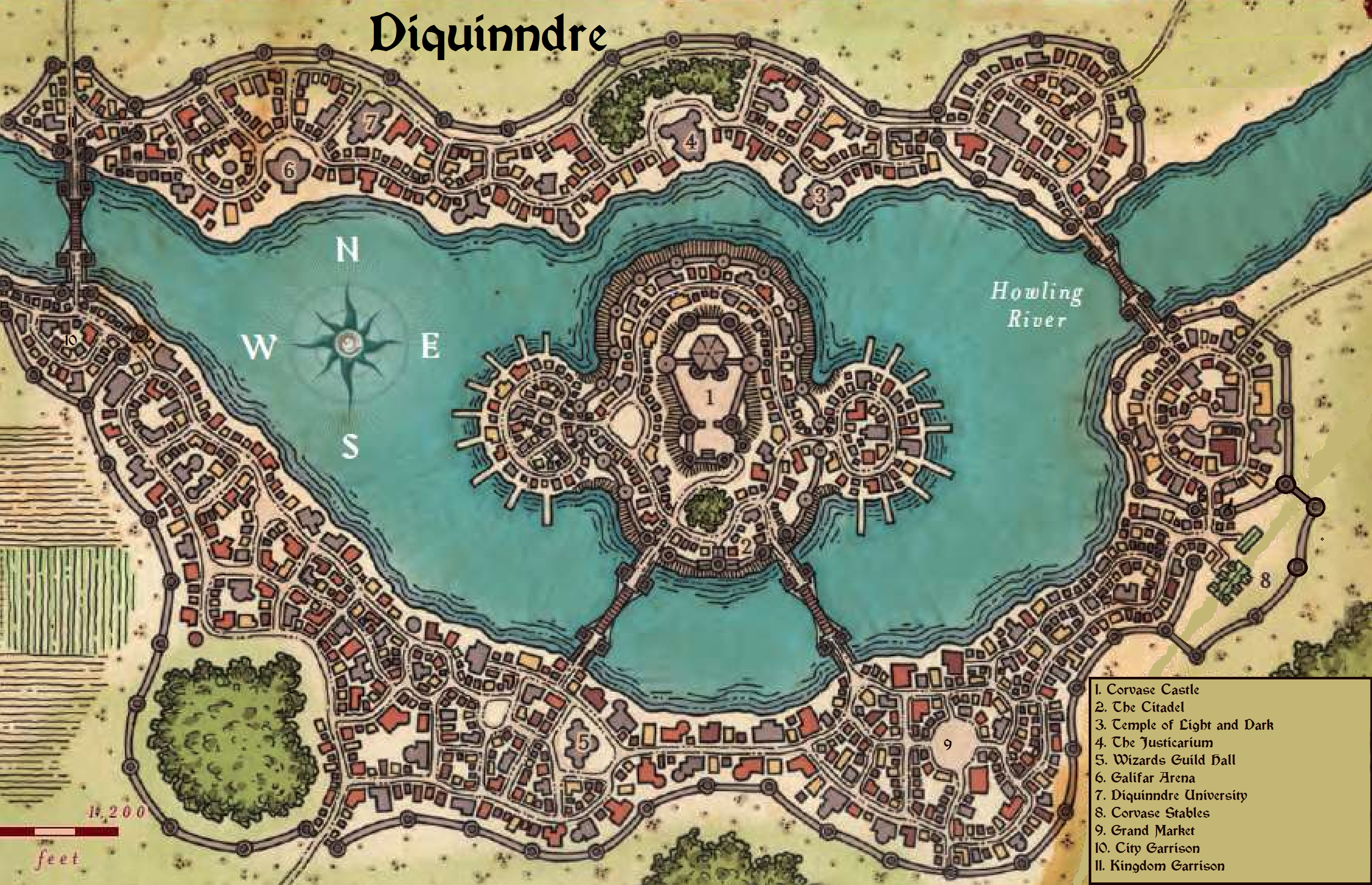 - Southbanks: Seat of trade and bureaucracy, including the Grand Market (9) and City Garrison (10).