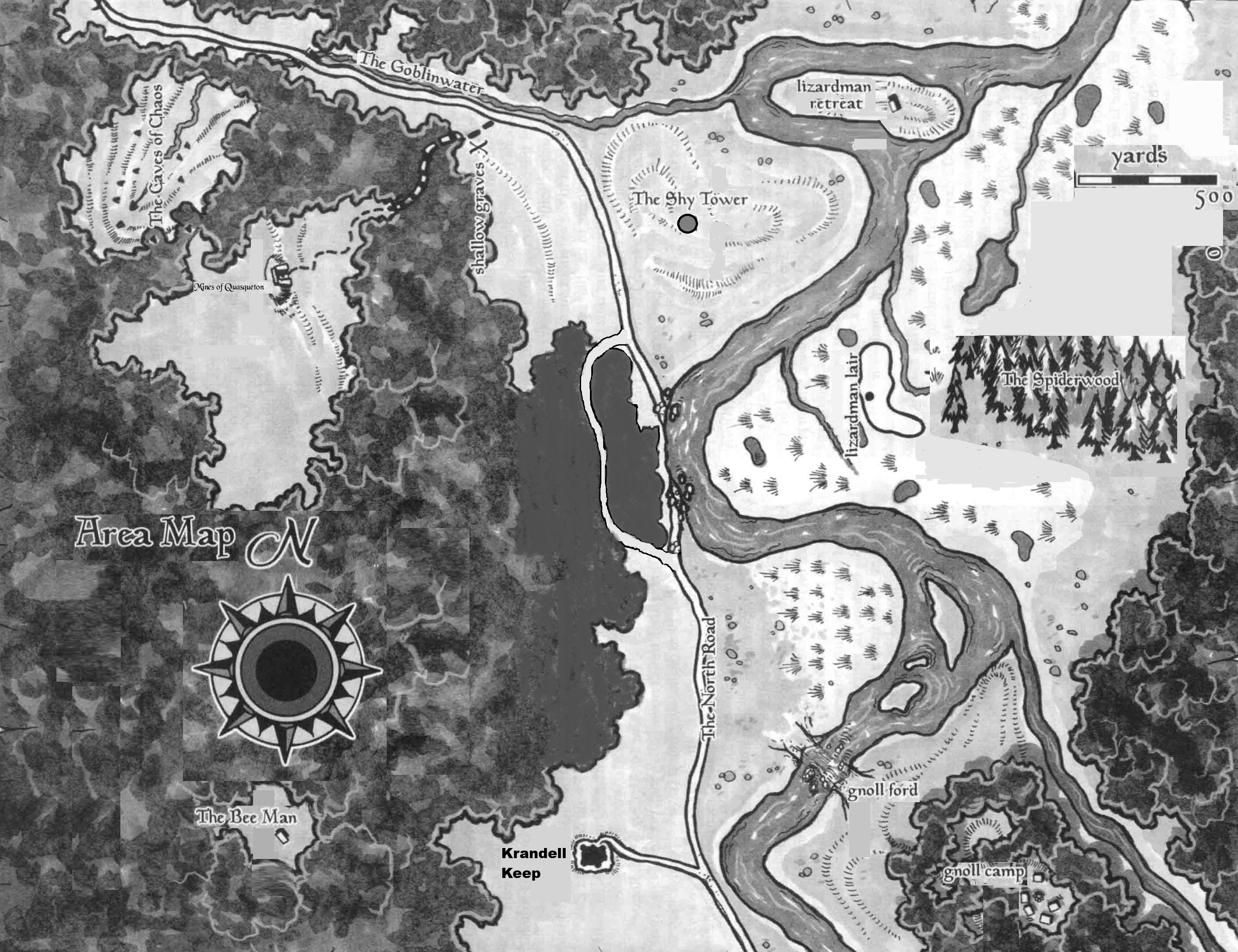To the north-northwest, beyond the last watchposts and into the shadowed ravines, lie the dreaded Caves of Chaos. Once sacred burial grounds of a forgotten Rhyanne sect, the caves have become a festering hive of corruption. Goblinoid tribes, chaos cults, and exiled warbands have carved out lairs within the stone, drawn by a dark power that pulses from a central altar deep within. The Duke maintains distant patrols, but the caves remain largely uncontrolled, a proving ground for heroes and a graveyard for the unworthy.