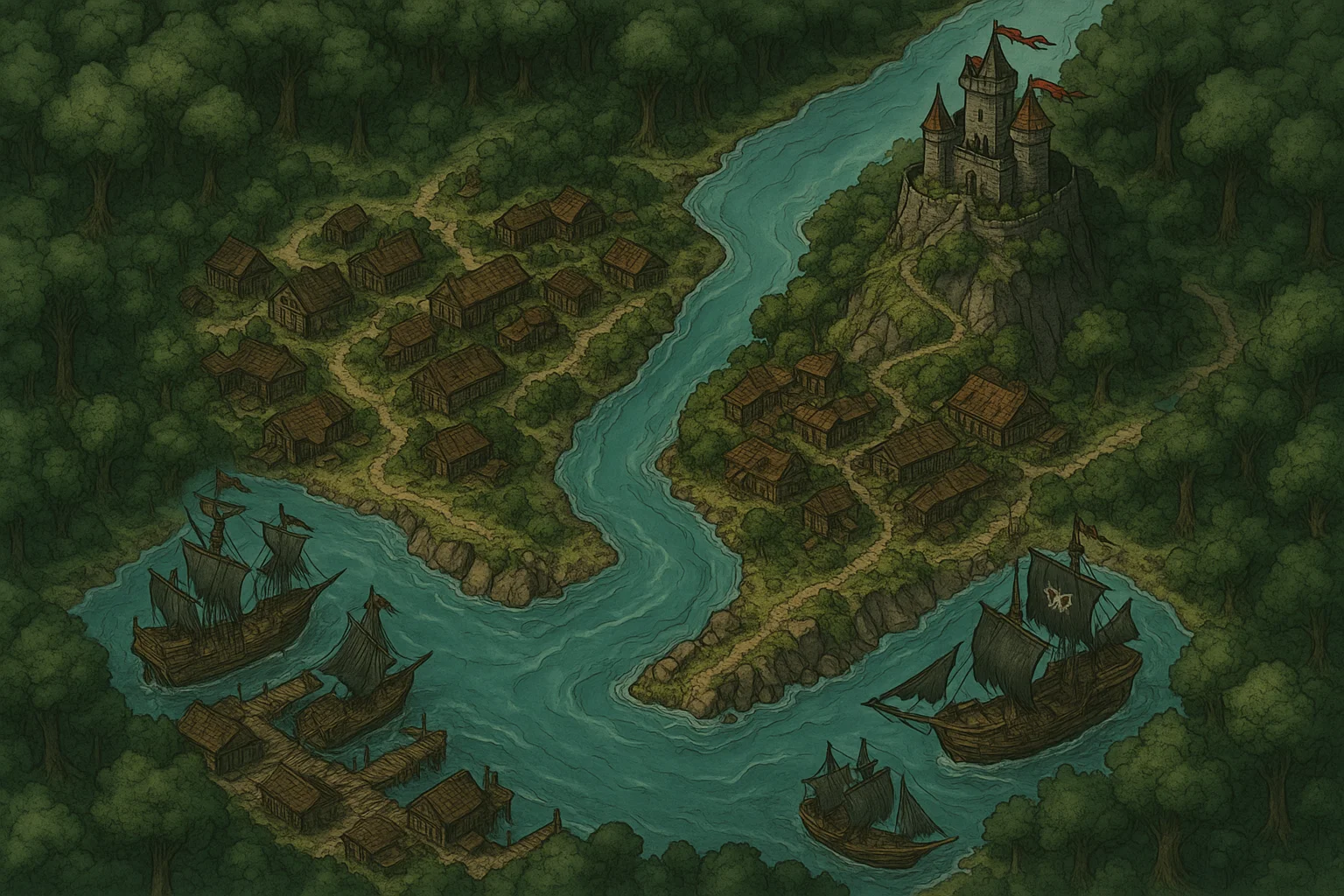 The town itself is built into the natural landscape of the Darkwood Forest, a place of towering trees that seem to stretch into the heavens, casting perpetual shadows over the town. These woods are ancient and full of secrets, known to harbor dangerous beasts, hidden paths, and even long-forgotten ruins from past civilizations. The town is positioned on a rocky outcrop at the mouth of the Ishara's Run, with its docks extending into the water, providing easy access for pirate vessels that sail under the cover of darkness.