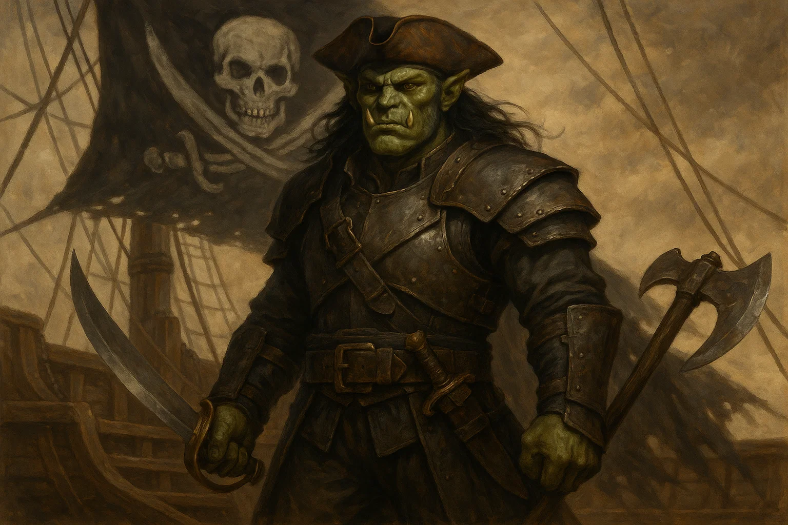 Ogree Bloodfang is a towering figure of power and influence. As the High Orc Sea Lord of Darkwood, he has earned his place through a combination of brutal conquest, cunning strategies, and sheer strength in battle. Ogree's rise to power began when he first sailed into Ishara's Run as a mere raider, leading a crew of outcasts and warriors. Through a series of calculated moves and a series of bloody confrontations with the previous pirate leaders, Ogree claimed the town as his own.