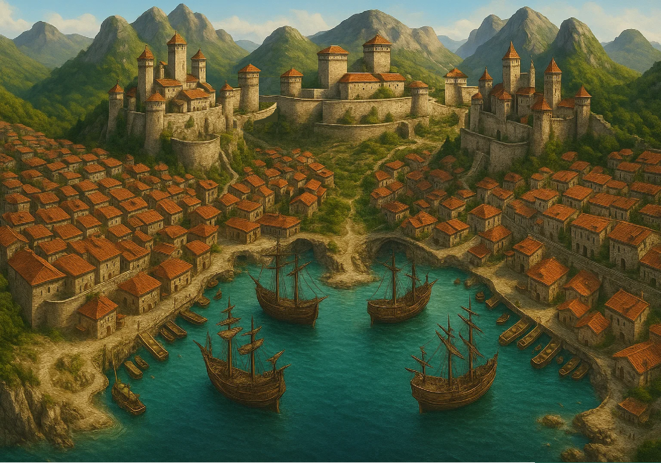 The city's centerpiece is the towering fortress of House Falconhand, an imposing structure built into the mountainside with its weathered stone walls and strong, defensive towers. The fortress, topped with red-tiled roofs, stands proudly above the city, symbolizing the family's unshakable grip on Kydmarra. The massive stone walls that encircle the fortress radiate outward, enclosing a series of terraced neighborhoods where narrow streets wind through rustic stone houses. These houses, each with their signature red roofs, cascade down towards the bustling harbor, reflecting the city's unique blend of pirate lawlessness and noble nobility.