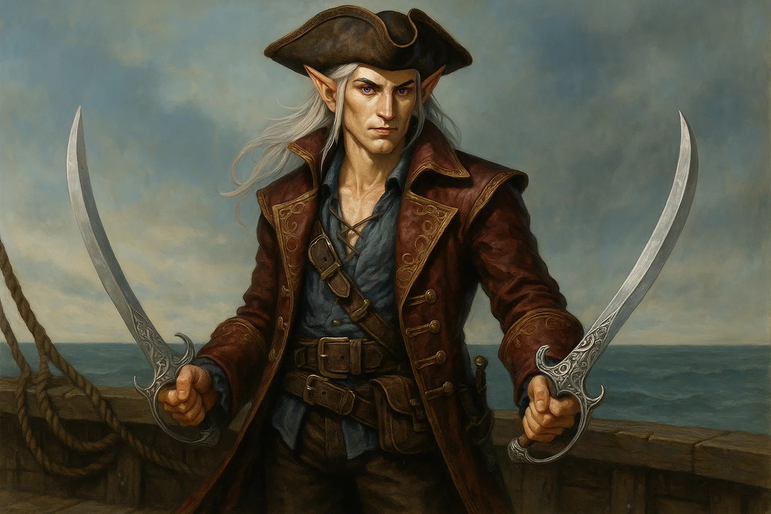 Baeldeth's leadership is subtle but effective. He commands loyalty not only through his strategic mind and military prowess but through intelligence. His knowledge of pirate politics, naval tactics, and diplomatic negotiations has earned him the trust of both his crew and the Arethane Royal Navy, which he serves loyally, despite his pirate persona.