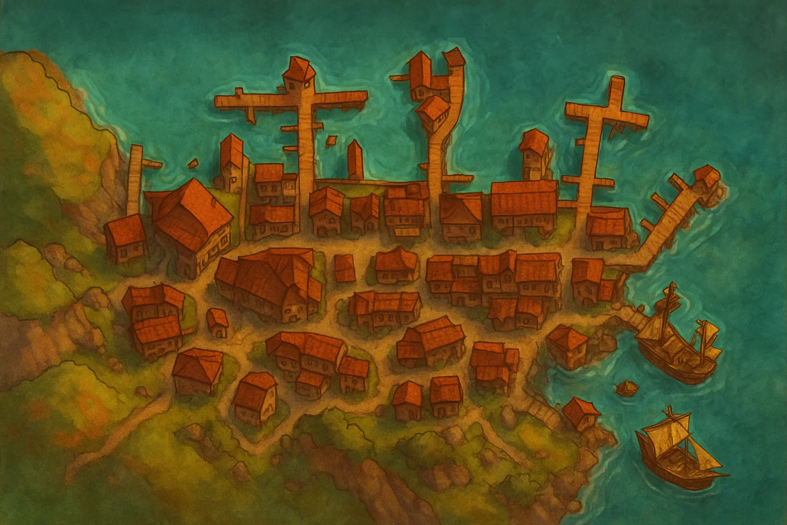 Nestled along the rugged northern coast of Cassiel Island, Kamenos is a lesser-known port town, yet one brimming with a reputation for shadowy dealings, hard-drinking sailors, and the kind of raw, untamed energy that the Pirate Isles are famous for. Located in a cove surrounded by sharp cliffs and jagged rocks, Kamenos is a place where the seas meet the land in a violent embrace, its harbor a haven for those looking to lay low or unload their ill-gotten goods without drawing attention.
