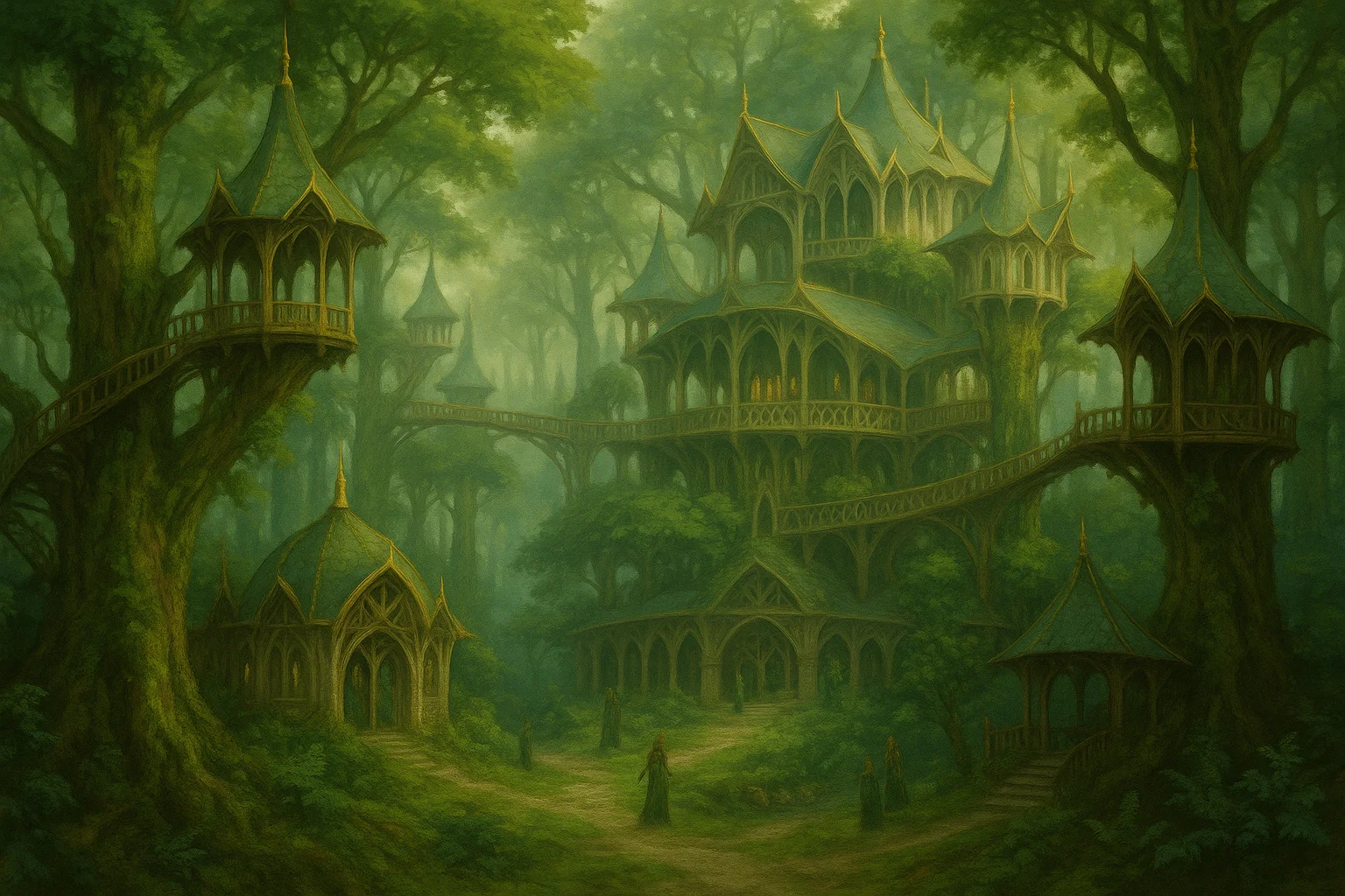 Wooden walkways and rope bridges crisscross the air, connecting homes, taverns, and watchposts in a labyrinthine network that only the locals truly understand. The structures are not merely built into the trees, they are part of them, grown and shaped through ancient elven magic that honors the forest while bending it to their will. Moss and ivy cling to every surface, and the scent of damp earth and wildflowers lingers in the air.