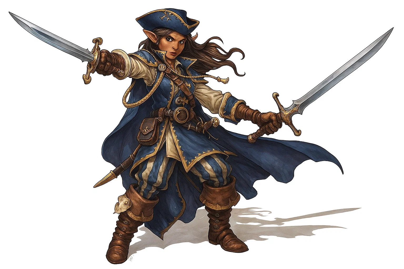 Her clothing is a blend of elegance and functionality, her dark cloak, often woven with threads that shimmer like moonlit water, marks her as both a queen of the deep and a commander of pirates. Her black leather armor, reinforced with shadowy enchantments, allows her to blend seamlessly into the darkness, and she wields a pair of short swords, their blades adorned with runes of shadow and tide.