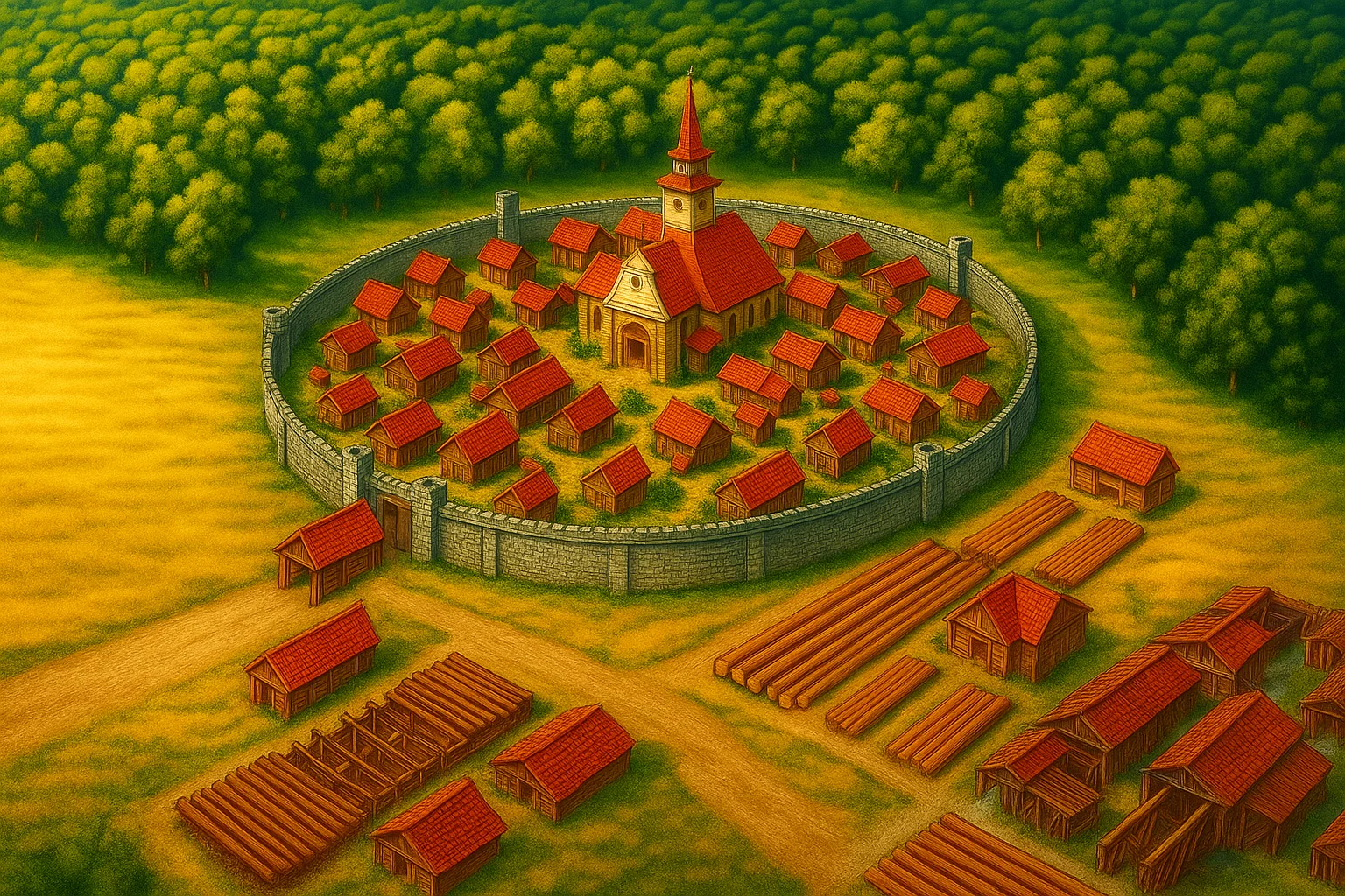 The town itself sits in a natural clearing at the edge of the Altryke Forest, a sprawling settlement with wide streets lined by sturdy wooden homes and workshops. The architecture of Sadisil reflects its industrious nature: sturdy, functional, and unpretentious. Massive sawmills dot the outskirts of the town, their constant hum and the scent of fresh-cut timber filling the air. The Great Yard, Sadisil's heart, is a sprawling collection of lumber stacks and drying sheds, where huge logs are brought in from the forest and worked into beams, masts, and other shipbuilding materials.