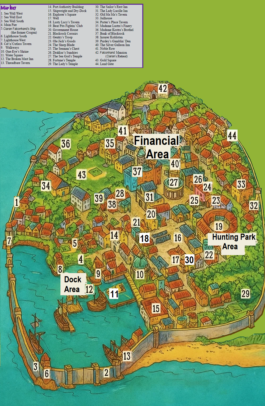 Government: Sea Lord Ciaran Falconhand rules Vin, a cunning and ruthless pirate leader who commands the respect and fear of pirates and traders alike. Ciaran's leadership is reinforced by the Vin Corsairs, a fiercely loyal group of elite pirate enforcers who keep order in the chaotic city. The government is somewhat anarchic, with Ciaran's decrees holding sway over the more lawless factions.