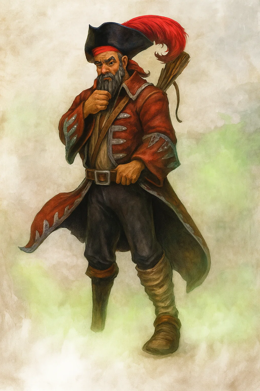 Silvio Devaulis, the Sea Lord of Zelenn, is a heavyset man with a striking presence. Despite his 215-pound frame, he is surprisingly nimble, his movements a testament to his years of sailing and surviving countless dangers. His most prominent feature is a worn-down peg leg, a reminder of his past. He wears a stylish, armored coat, which he slips on when trouble brews, and carries a well-crafted crossbow and light mace as his weapons of choice. His vanity is undeniable, spending time each morning meticulously grooming his scraggly hair and thick beard before donning his signature tricorn hat with a red plume.