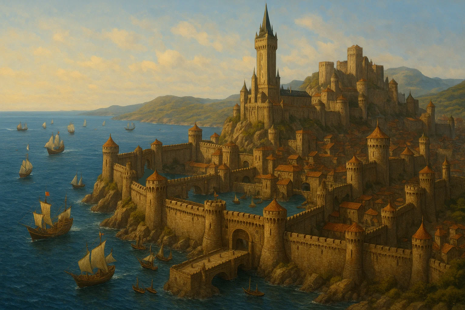 The Grand Basin Docks are a sprawling network of piers and wharves, designed to accommodate the city's massive navy and the many trade vessels that enter the bay. The docks are fortified with heavy chains and retractable gates that can be closed in the event of a sea assault, ensuring the safety of the city's vessels. Large cranes and winches are used to unload goods, while dockside warehouses hold valuable commodities, including exotic spices, metals, and textiles from across the known world.