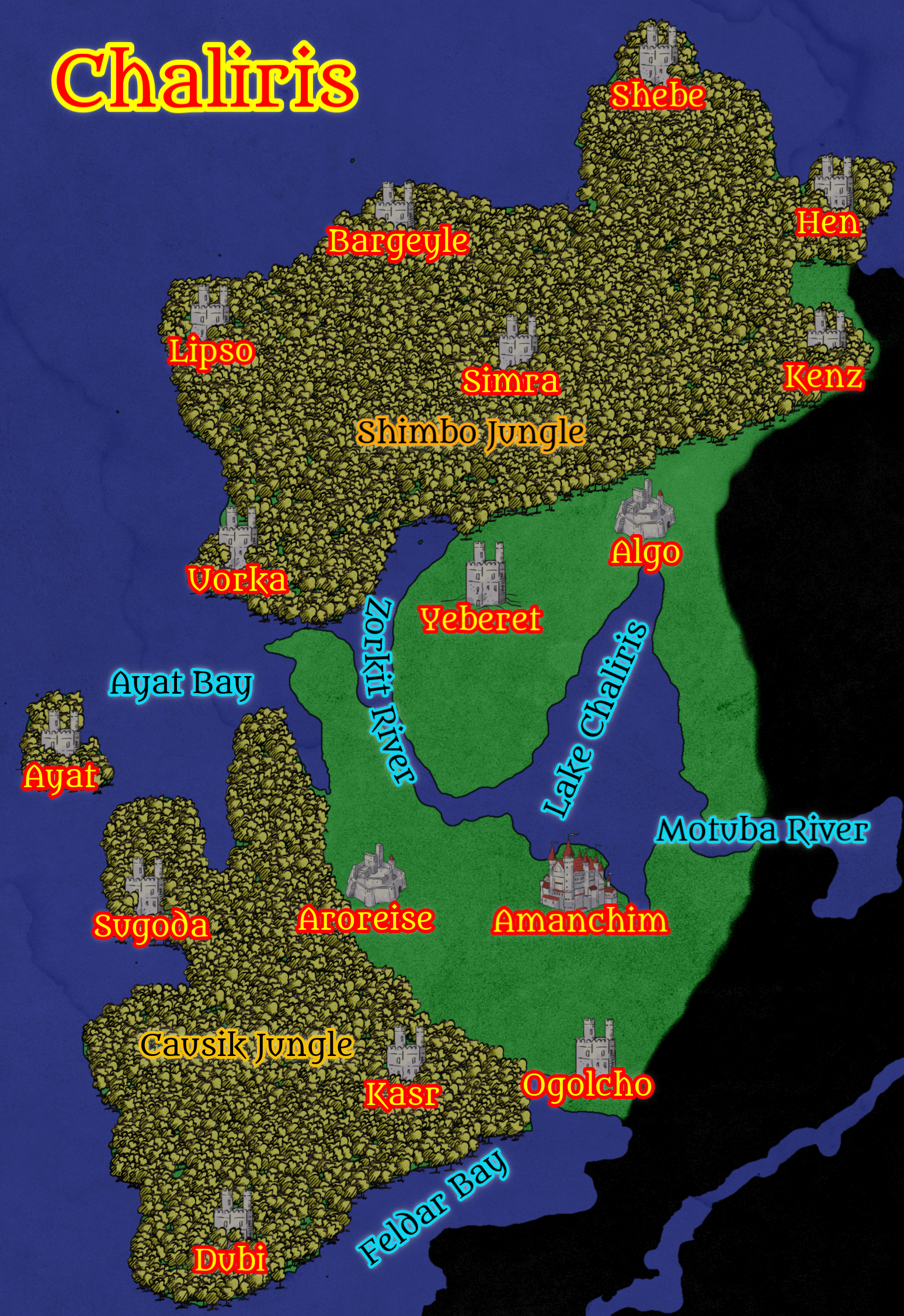 - Amanchim, Capital of Chaliris: The heart of Chaliris, Amanchim is the political and military center of the province. Known for its strong fortifications and strategic position, it serves as the headquarters for both the military and administrative leadership.