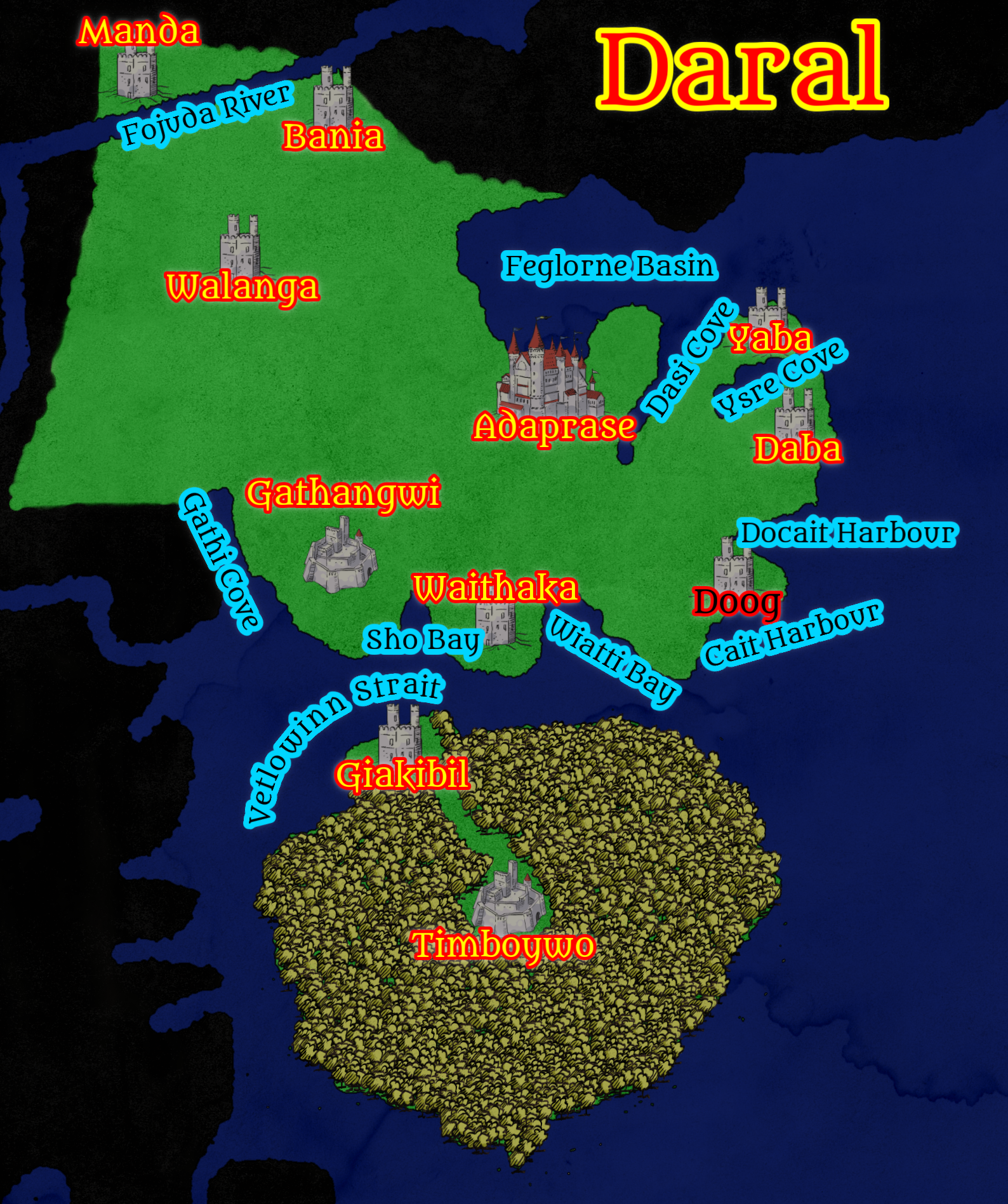 - Timboywo: Timboywo is Daral's southern fortress and sits in the center of the Island Jungle. It is the supplier of all lumber used in Daral's ship production. Life in Timboywo is strict, regimented, and loyal; its people are born to service. When storms roll in, the city's forges glow like molten eyes against the dark sea, crafting the iron hearts of Daral's fleet.