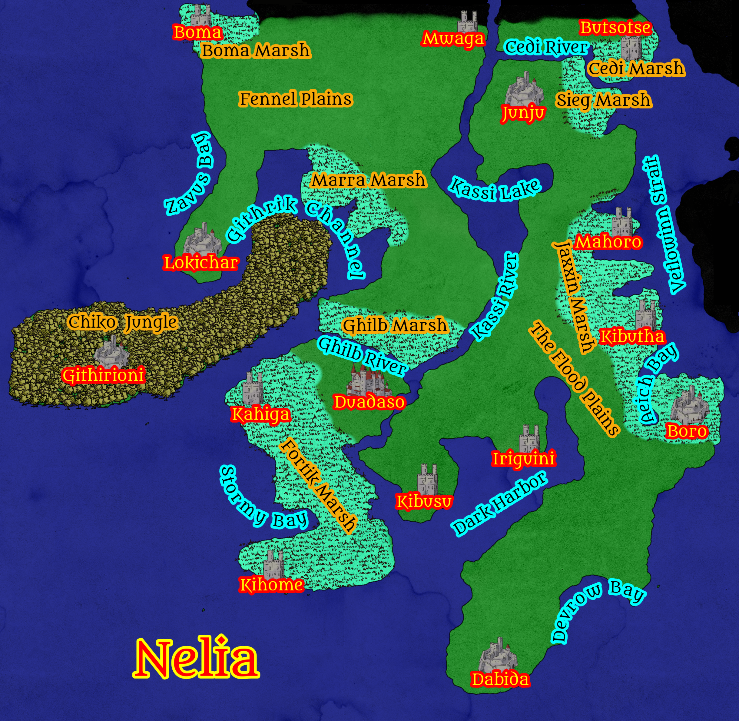 - Boma: Located at the northern edge of Nelia, Boma is a fortified port town guarding traffic from northern incursions. It is known for its reed-armored militias and extensive fish markets. The people here are hardy marsh-dwellers, respected for their skill in crafting boats that can maneuver in both shallow waters and open lake-like expanses.