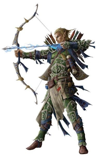 Attribute Requirements: P.S. 10, P.P 14 and Per 12 or higher. Alignment: Any, but usually Honourable. Gender: Male or Female Race: Elf or Half Elf Only O.C.C. Bonus: Bonuses: +1 to pull punch, and + 1 to save vs horror factor at levels 1,3,7, l0 and 13. O.C.C. Skills: Acrobatics Languages: Native Tongue at 98% plus one of choice (+10%) Bowyer/Fletcher(+25%) Sniper Wilderness Survival (+10%) W.P. All Bow Types W.P. Targeting W.P. One of choice Hand to Hand: Archer Spell Casting O.C.C. Related Skills: Select eight other skills at level one, plus 1 per level starting at level 2. All new skills start at Level. One proficiency Communications: Sign language only (+5%). Domestic: Any. Espionage: Any (+5%). Horsemanship: General or Exotic only (+5%). Labour: Any. Medical: First Aid only (+5%). Military: Any (+10%). Naval: Any. Performing Arts: Any. Physical: Any, except Acrobatics. Rogue: Any. Science: Mathematics only. Scholar/Technical: Any (+5%). Weapon Proficiencies: Any. Wilderness: Any. Secondary Skills: Choose 4 at level 1, plus 1 per level starting at level 2. All new skills start at Level. One proficiency. These are additional areas of knowledge that don't get the O.C.C. bonus. Starting Equipment: Two sets of clothing, hooded cape or cloak, boots, a pair of gloves, belt, bedroll, backpack, one large sack, two small sacks, a quiver for arrows, sharpening stone, a water skin, Armour: Starts with a suit of studded leather (A.R. 13,38 S.D.C.)or Elven Chain (A.R. 15, 90 S.D.C.). Weapons: Starts with a knife, long bow, quiver with 32 long bow arrows, and one other weapon of choice. All are basic S.D.C. weapons of good quality. Magic weapons and other items must be acquired later.