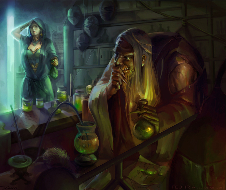 An alchemist is frequently an elf, changeling, metamorphized dragon, or another long-lived creature. A human alchemist will always be quite elderly. The prerequisites for becoming an alchemist are extremely taxing and usually requires decades of study in several fields of magic and scholarly pursuits. The study of racial histories, biology, mathematics, chemistry, medicine, herbology, the supernatural, all lore’s, literacy in Elven, Dwarven, Runes and ancient languages and tongues, the recording and study of legends, myths and rumors (especially when regarding magic abilities, artifacts and related), identifying and interpreting magic items and enchantments, and, most importantly, the combinations of magics (making components, potions, fumes, etc.), are all part of the alchemist’s decades of study, knowledge and skill. Most humans, wolfen and similarly short-live beings (under 100 years) don’t master alchemy until quite old (50+ years) and is way beyond the realistic aspirations of any “player” character.