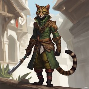Description: Felisians are cat-like humanoids who stand around five feet tall, with sleek, agile bodies covered in short fur. Their fur patterns and colors can vary, resembling both domesticated and wild cats, and they possess non-prehensile tails. Felisians have sharp feline features, including pointed ears and vivid eyes adapted for low-light vision. They are known for their quick reflexes, grace, and agility, which make them adept hunters and skilled fighters. While their society values simplicity and balance with nature, their deep curiosity can lead some Felisians to seek adventure or knowledge beyond their forested homelands. Felisians live in tight-knit, clan-based societies where the values of family loyalty, respect for elders, and disciplined lifestyles are paramount. Each Felisian clan functions almost like a large, extended family, and the social structure revolves around communal cooperation. Within these societies, respect for tradition and reverence for nature form the core of their daily lives. Elders hold positions of great importance, as they are seen as the keepers of wisdom and the ones who guide the younger generation in the ways of their ancestors. Decisions affecting the community are made through careful deliberation, with the elders playing a crucial advisory role. Felisians build their homes using materials readily found in their natural environment—wood, stone, and fibers from plants. These materials are crafted with great care and artistry, producing intricate carvings, statues, and functional buildings that blend harmoniously with the dense forests and jungles that serve as their natural habitat. Their architecture is designed not to disrupt the natural beauty around them but to exist in harmony with it, creating towns that are nearly invisible from afar, hidden among the trees and foliage. Pathways and streets often seem like natural clearings, and many homes are built into or around ancient trees. Although most Felisians prefer the quiet, peaceful existence that life within their secluded communities offers, a strong sense of curiosity exists among them. Occasionally, this curiosity leads some to venture beyond the safety of their homelands, driven by the desire to explore the wider world, seek new experiences, or even prove themselves as adventurers. These Felisians often become skilled scouts, rangers, or thieves, using their natural abilities to survive in unfamiliar lands. Felisians are primarily nocturnal, favoring the stillness of the night for their daily activities. This is not only because they prefer the cool, quiet hours of darkness but also because their keen night vision and exceptional hearing give them a significant advantage when hunting or patrolling their territories. Skilled hunters and expert trackers, Felisians can move silently through dense underbrush, making them nearly impossible to detect. They are renowned for their ability to stalk prey for miles without being noticed, only striking when the moment is right. Despite their peaceful nature, Felisians can be incredibly fierce when provoked. They are highly protective of their families, clans, and sacred sites dedicated to the cat goddess Bastisor, which are scattered throughout their territories. Any perceived threat to these sacred places or their loved ones is met with swift and decisive action. When it comes to battle, Felisians are agile and quick, using their natural speed and reflexes to outmaneuver opponents, whether in hand-to-hand combat or through the use of ranged weapons such as bows. Craftsmanship holds a special place in Felisian society. They are master woodworkers and stone carvers, creating beautiful and functional works of art that are highly prized by traders and collectors from other cultures. Their carvings often depict scenes of nature, stories from their mythology, or intricate representations of Bastisor. Felisians also produce finely crafted tools, weapons, and armor, though these are often light and designed for agility rather than brute strength. The Felisians maintain a cautious relationship with the outside world, engaging in trade only with trusted allies. Their insular nature has made them wary of other races, especially those who do not respect the natural world. Of all the races they encounter, Felisians harbor the greatest animosity toward dog-like races, such as the caneins, with whom they have a long history of conflict. This rivalry is deeply ingrained in their culture, with stories of battles and betrayals passed down through generations. Even in peaceful times, interactions between Felisians and canine races are tense and marked by distrust. Overall, Felisians are a people of grace, balance, and quiet strength, preferring to live harmoniously with their surroundings but always ready to defend their way of life when necessary. They are proud of their heritage and the traditions they have maintained for centuries, guarding their homes and sacred sites with the same ferocity they use to protect their families. Combat: In combat, Felisians rely heavily on their speed, agility, and keen senses. Their natural dexterity gives them an edge when dodging attacks, and they are proficient with light weapons, particularly short swords, bows, and throwing daggers. Felisians can also use their retractable claws in close combat, dealing 1d4 damage with a successful strike. Additionally, their enhanced vision allows them to see up to 60 feet in dim light, giving them an advantage in nocturnal ambushes. Felisians are known for their stealth and precision, often preferring to strike quickly and retreat before their opponents can counter. They receive bonuses to initiative and dodge, and can leap great distances, giving them a tactical advantage in mobile skirmishes. Habitat/Society: Felisians live in clan-based communities deep within forests and jungles, where their homes are constructed from natural materials like wood and stone. Their settlements blend seaml