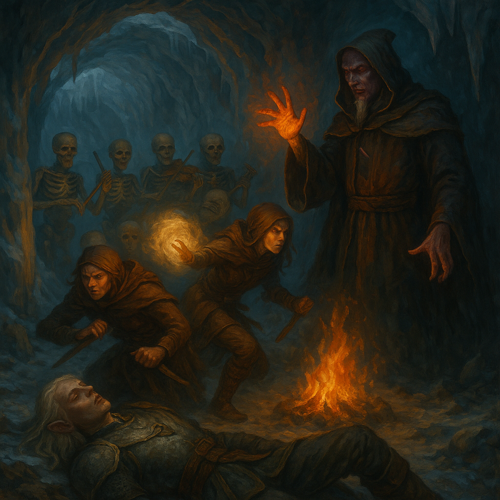 Six skeletons, their bones clacking rhythmically as they played spectral instruments, violins, flutes, drums, all hollow notes that resonated through the air, joining in the strange melody that hung in the atmosphere. At the far side of the chamber, standing beneath an archway of black stone, was a figure cloaked in dark robes, his eyes glowing with unnatural light. A Drow, an ancient one, whose power radiated from him in waves. He watched them with a look of amusement, his lips curled into a cruel smile.